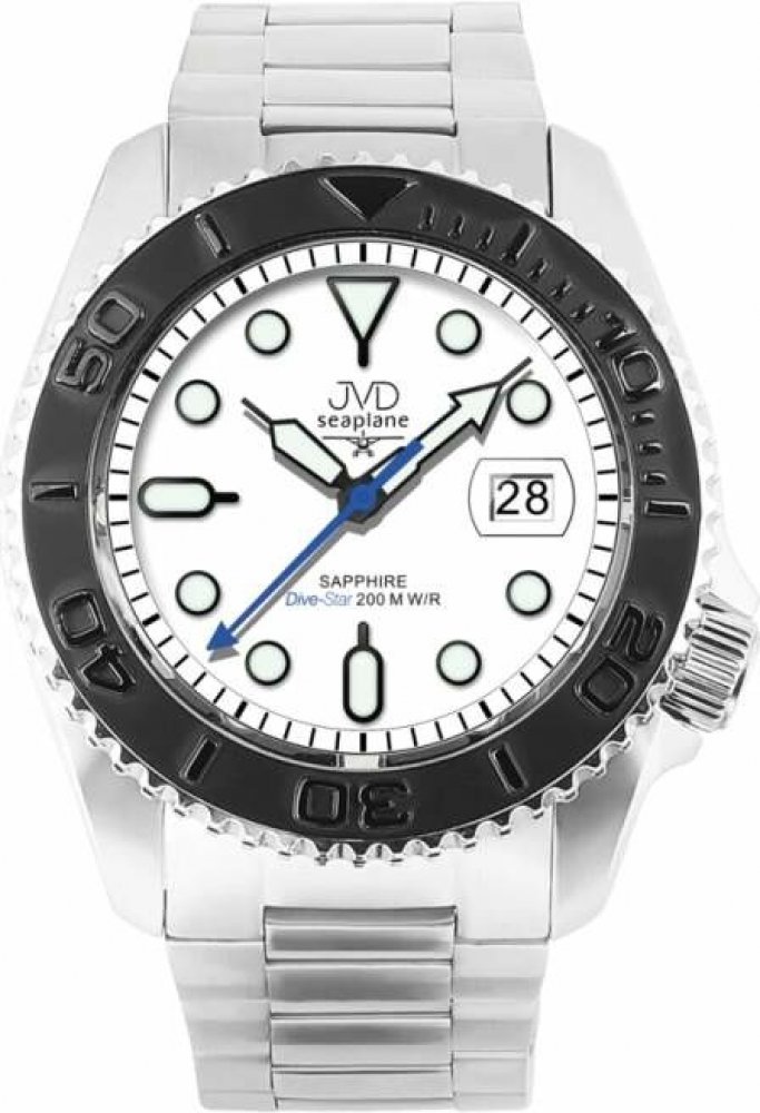 JVD analogové ocel sportovní pánské bateriové - quartz pro potápění (100+ m) 45.0 mm ocel 200 m bateriové 0.14 g safírové Seaplane kulaté stříbrná bílá s luminiscencí 2.4 cm na ruku české bez číslic stříbrná ocel 4.5 cm velké 24.0 mm 45 mm s dočasným svícením (luminiscence/LED) s nenáročnou údržbou (quartz) bez chytrých funkcí