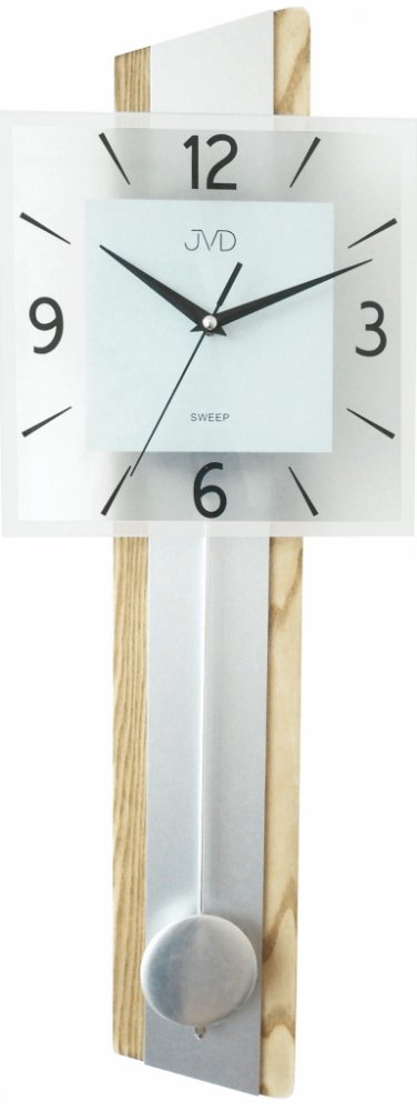 Dřevěné kyvadlové hodiny JVD NS19030.1 s plynulým chodem Hranaté hodiny JVD mají základnu vyrobenu ze světle hnědého dřeva, které je ve středu kombinováno se stříbrným lakem. Čas na číselníku z mléčného skla ukazuje kombinace dobře čitelných indexů a arabských číslic, můžete se tak spolehnout na velmi dobrou čitelnost času i z větší dálky. Kyvadlové hodiny pohání quartzový (bateriový) strojek s pl...