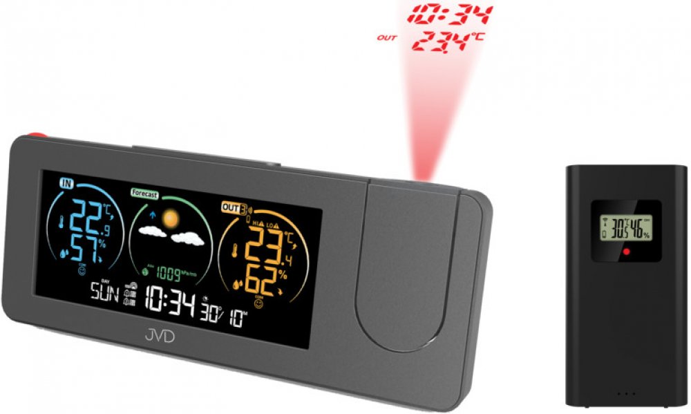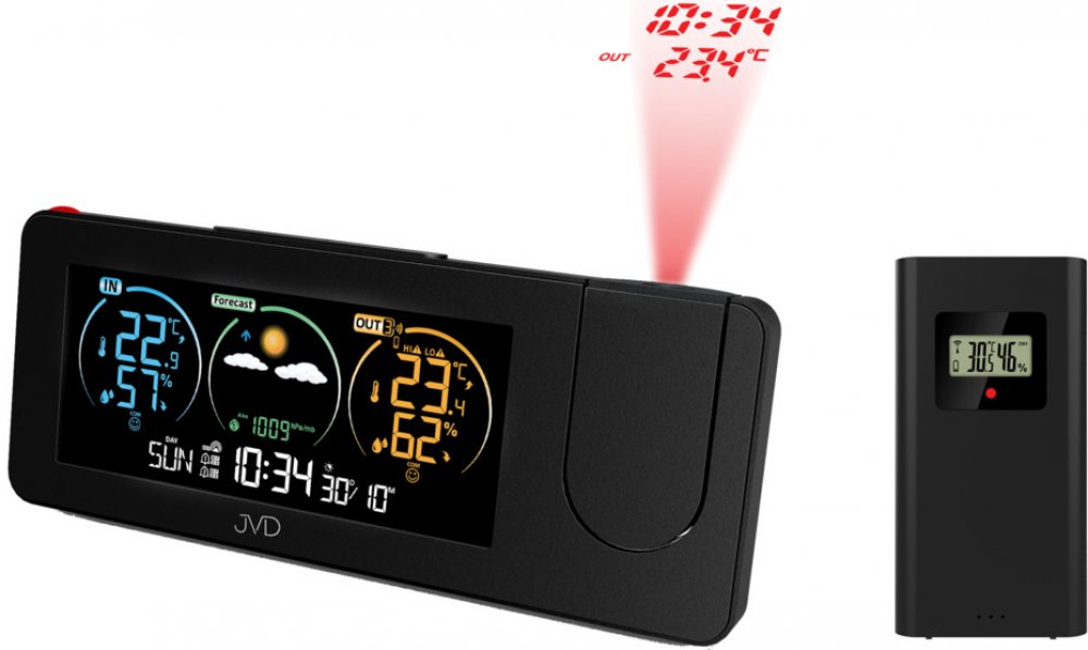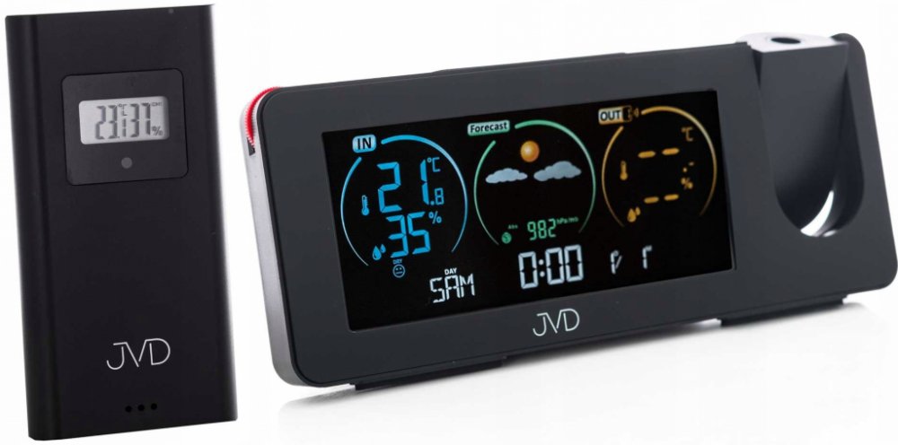Nový rádiem řízený svítící budík JVD RB3538 s multifunkčním projektorem a bezdrátovým venkovním senzorem, který spolehlivě změří teplotu a vlhkost. Hned po probuzení budete vědět, jak se ustrojit a díky předpovědi si při odchodu z domu přibalíte sluneční brýle nebo deštník...Tento budík Vás také upoutá svým originálním a moderním vzhledem. Displej je krásně čitelný díky kontrastním údajům na tmav...