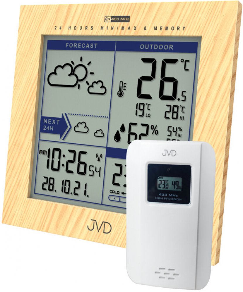 JVD RB9233.1 – Elegantní meteostanice v dekoru světlého dřeva. Rádiem řízený čas (DCF), měření vnitřní/venkovní teploty a vlhkosti. Budík, kalendář a bezdrátové čidlo v ceně. Ideální doplněk moderního interiéru.