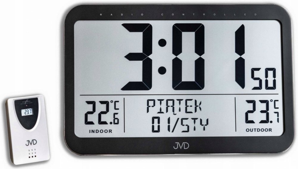 Rádiem řízené digitální hodiny na zeď nebo na stůl s datumem s českým názvem dne v týdnu, venkovním a vnitřím teploměrem a vlhkoměrem.