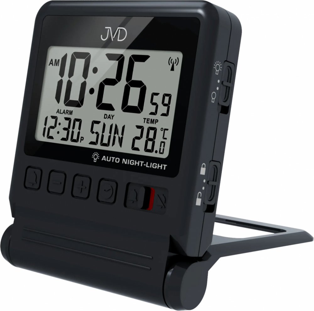 Digitální budík řízený rádiovým signálem JVD RB9391 s jednoduchým ovládáním, velmi dobře čitelným displejem a spoustou užitečných funkcí. Jednou z nich je ukazatel dne v češtině.Tento digitální budík je také na vteřinu přesný díky automatickému seřízení rádiovým signálem z Německa. Je možné na něm nastavit buzení pípáním s postupným zesilováním a především, umí se automaticky podsvítit po setmění....