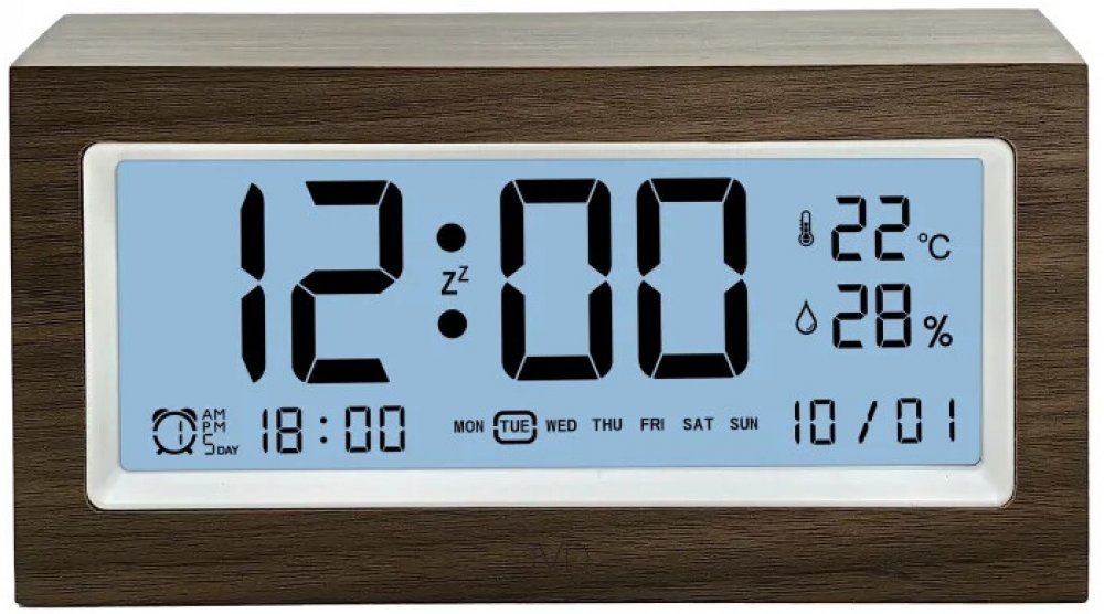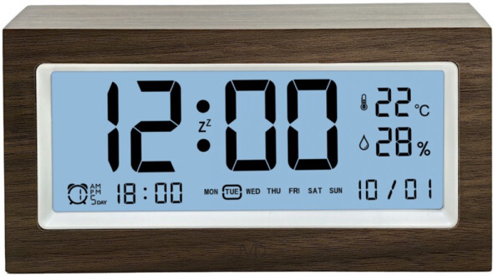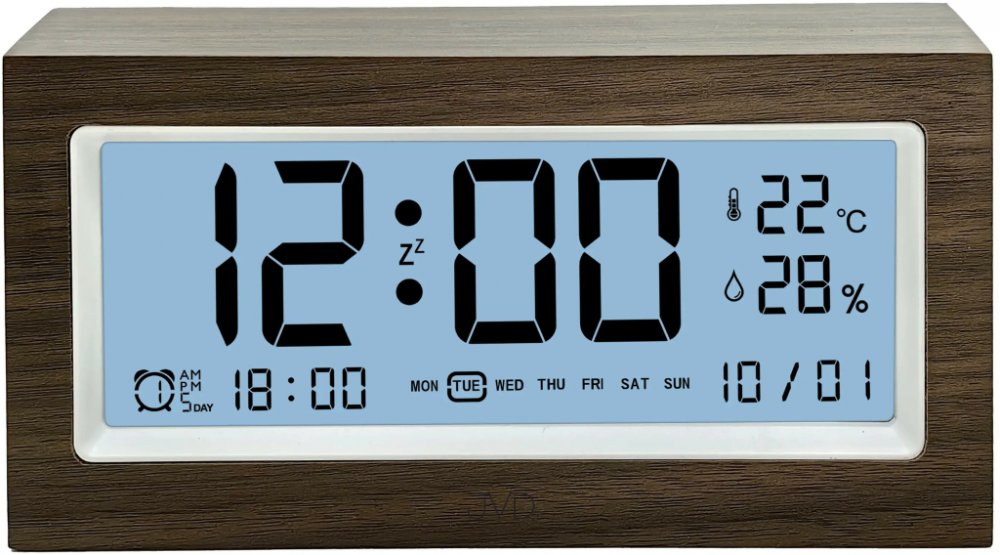 Stylový digitální budík JVD spojuje elegantní přírodní vzhled tmavého dřeva s velkým a dokonale čitelným displejem. Je ideální do ložnice, kanceláře i dětského pokoje a díky praktickým funkcím máš vždy přehled o času, datu i aktuálních podmínkách v místnosti.