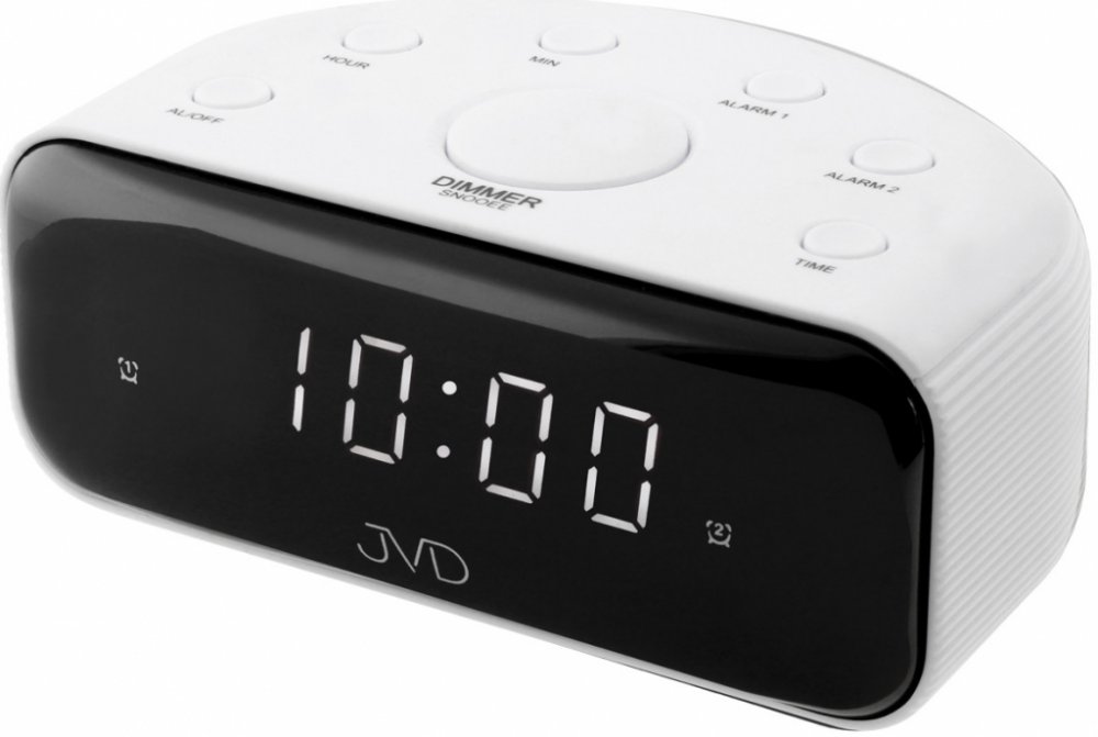 Moderní budík značky JVD do sítě se svítícími číslicemi a opakovaným buzením.