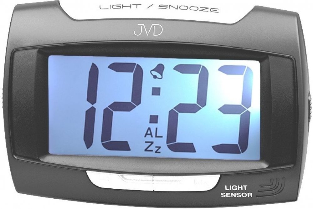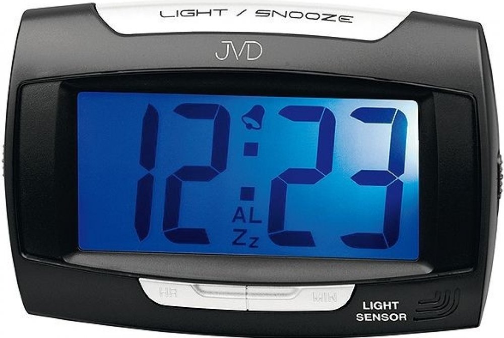 Moderní digitální budík značky JVD se světelným čidlem, který samovolně reguluje jas displeje.