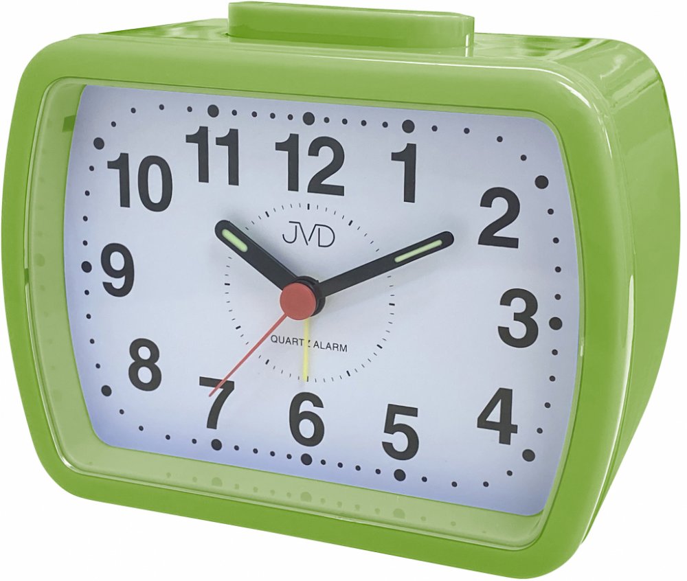 Analogový budík JVD SR309.5 Moderní budík JVD s natištěnými, dobře čitelnými arabskými čísly a mechanickým zvoněním. Přesný čas zajistí quartzový (bateriový) strojek s praktickým vypínáním zvonění shora budíku.