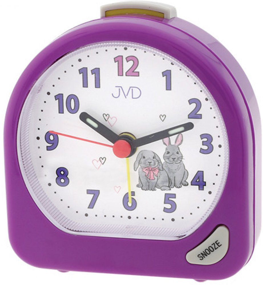 Dětský budík JVD s výraznými, dobře čitelnými arabskými čísly a osvětlením. Tento fialový budík s králíčky na číselníku Vaši malou princeznu zaručeně potěší. Výhodou budíku je postupné zesilování zvonění, které zajistí poklidné probuzení a pokud patříte mezi velké spáče, o probuzení se postará opakované zvonění se 4-minutovým intervalem. Budík lze také nastavit tak, aby zvonil jen v pracovní dny. Přesný čas zajistí quartzový (bateriový) strojek.