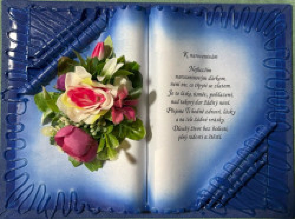 Kniha balená v průsvitném celofánu, na stojánku, převázanou mašličkou postavená na měděném stojánku.