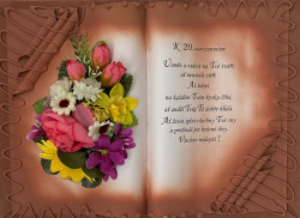 Kniha balená v průsvitném celofánu, na stojánku, převázanou mašličkou postavená na měděném stojánku.