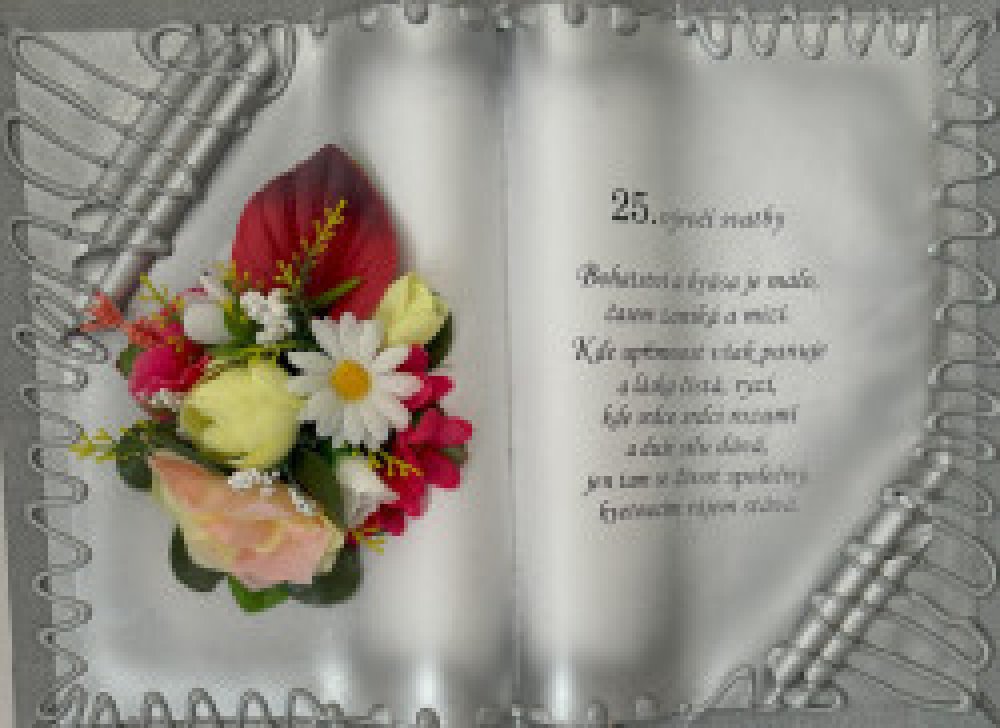 Kniha balená v průsvitném celofánu, na stojánku, převázanou mašličkou postavená na měděném stojánku.