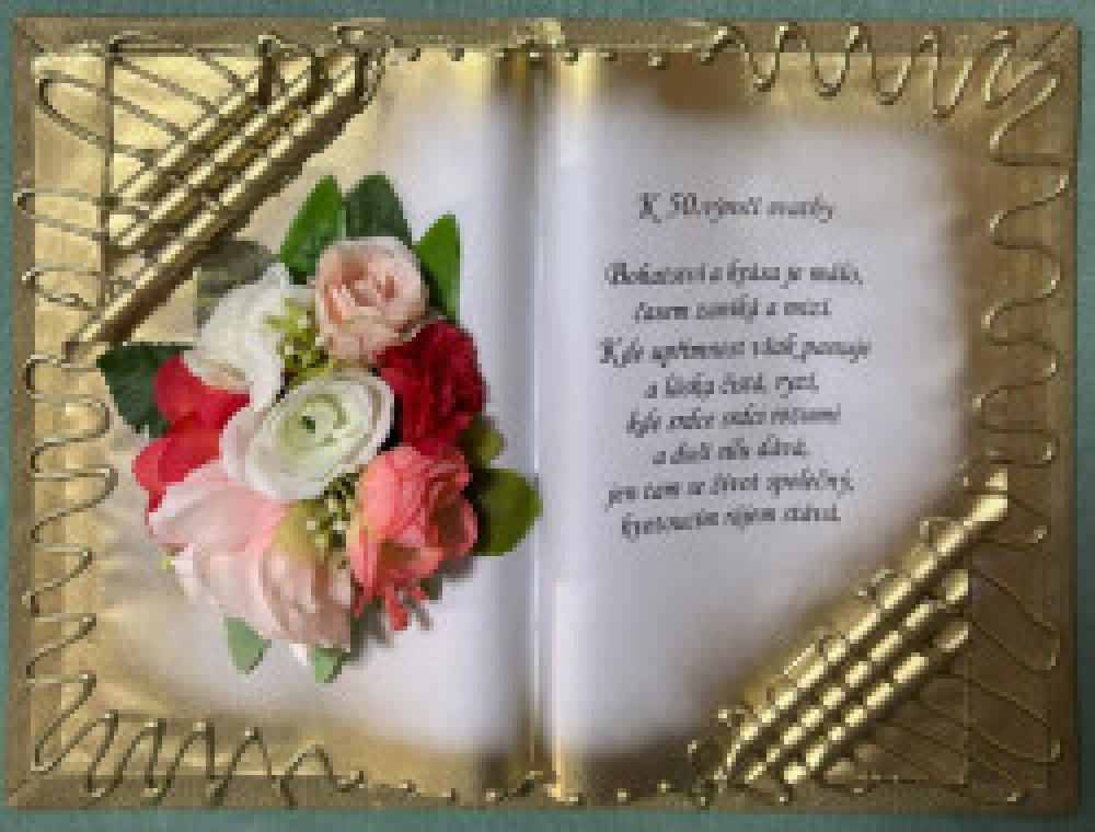 Kniha balená v průsvitném celofánu, na stojánku, převázanou mašličkou postavená na měděném stojánku.