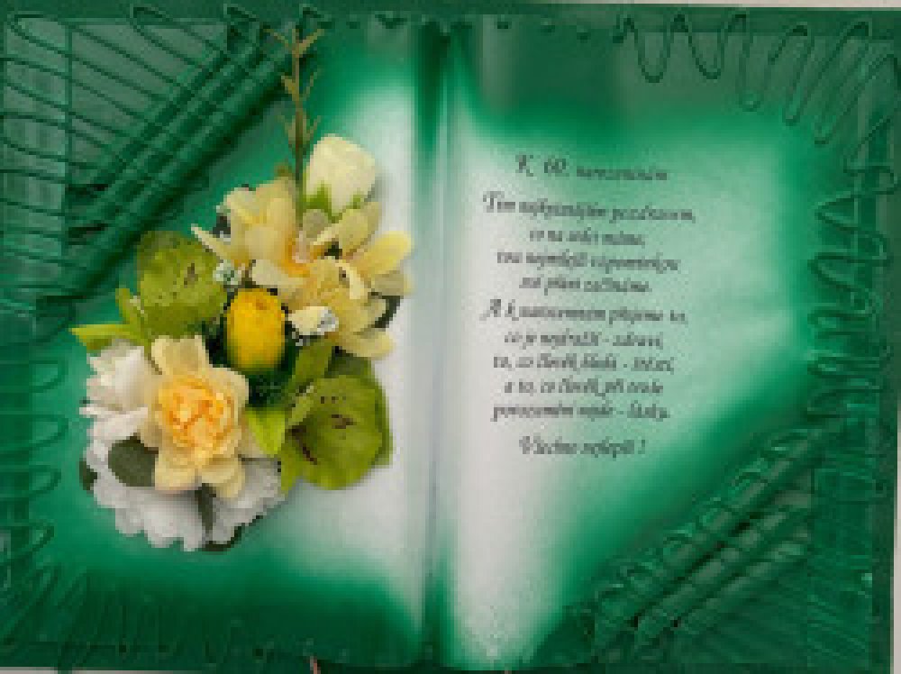 Kniha balená v průsvitném celofánu, na stojánku, převázanou mašličkou postavená na měděném stojánku.