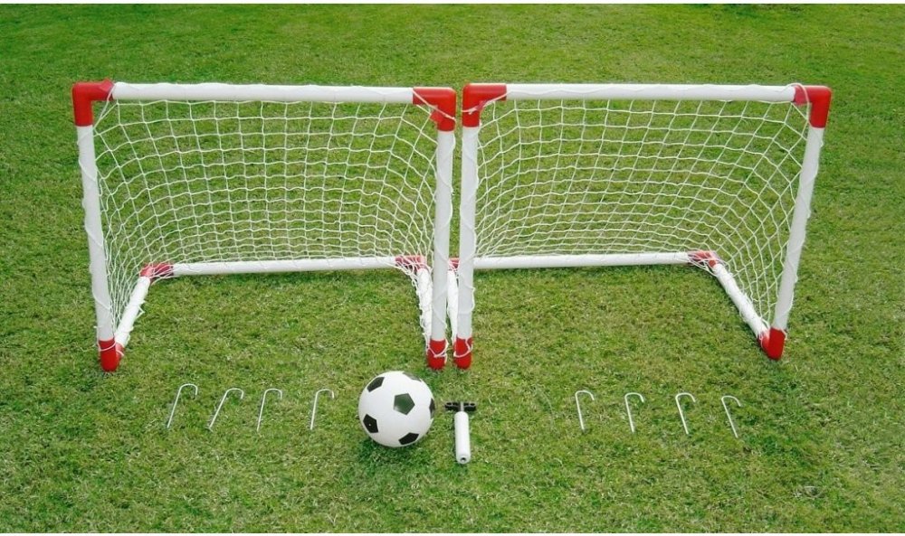 balení: 2x branka včetně sítě, 8x háky na upevnění do země, 1x hustilka, 1x vinyl míč