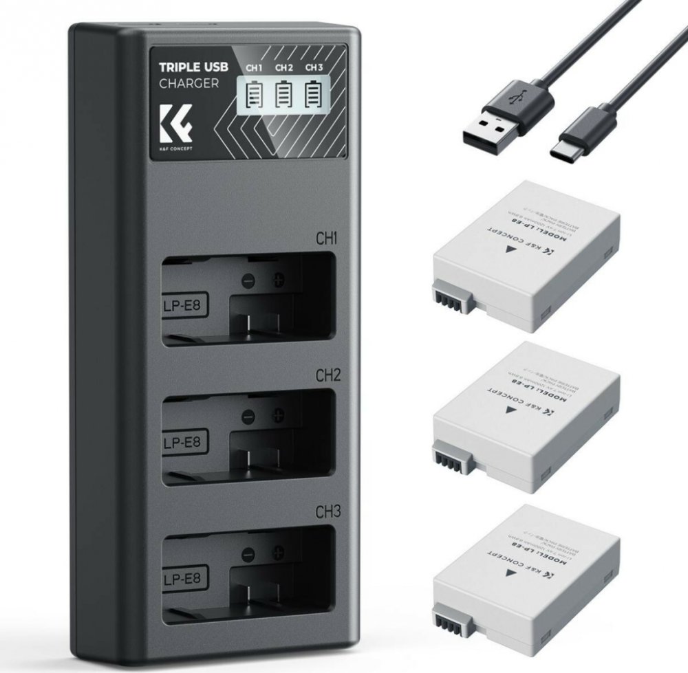 K&F Concept 3-pack baterií Canon LP-E8 pro fotoaparáty s 3-slotovou LCD nabíječkou. Obsahuje baterie LP-E8 s kapacitou 1200 mAh a nabíječku s LCD displejem a duálním vstupem Micro USB/Type-C pro rychlé a bezpečné nabíjení.Sada baterií K&F Concept Canon LP-E8 obsahuje 3 vysokokapacitní baterie LP-E8 s kapacitou 1200 mAh a napětím 7,4 V, které poskytují spolehlivý a dlouhotrvající výkon pro nepřetrž...