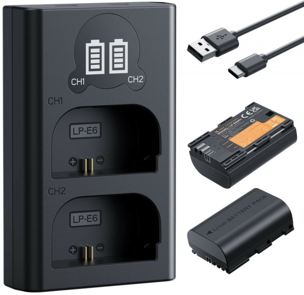 Sada baterií K&F Concept Canon LP-E6NH pro fotoaparáty s 2 bateriemi 2600 mAh a nabíječkou s dvěma sloty a LCD displejem, vybavená vstupy typu C a Micro-USB pro rychlé a bezpečné nabíjení.Sada baterií K&F Concept Canon LP-E6NH obsahuje dvě vysokokapacitní baterie 2600 mAh (18,72 Wh), které poskytují delší výdrž pro nepřetržité fotografování během dlouhých sezení. Tyto baterie jsou určeny pro fotoaparáty Canon EOS R5, R6, R7, 5D Mark IV, 6D Mark II, 7D Mark II, 90D, 80D a další fotoaparáty kompatibilní s LP-E6NH/LP-E6N/LP-E6 a zajišťují spolehlivý výkon pro profesionální fotografování a videografii.