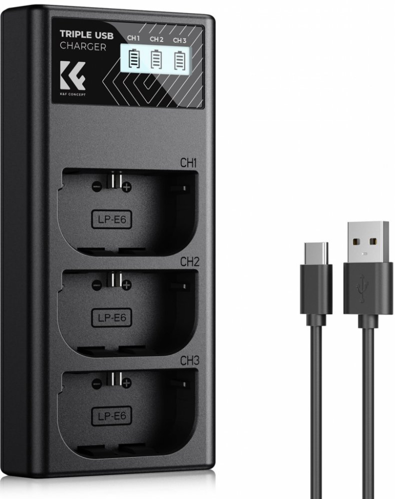 Mějte baterie Canon LP-E6NH nabité a připravené s nabíječkou K&F Concept 3-Pack. Nabíječka se třemi sloty, inteligentním displejem LCD a univerzálními možnostmi nabíjení přes USB a Type-C je ideálním společníkem pro fotografy na cestách.Nabíječka K&F Concept Canon LP-E6NH 3-Pack s LCD displejem představuje efektivní a spolehlivé řešení nabíjení pro profesionální i amatérské fotografy. Tato nabíječka je navržena pro nabíjení až tří baterií Canon LP-E6NH současně a je ideální pro delší fotografování a cestování.