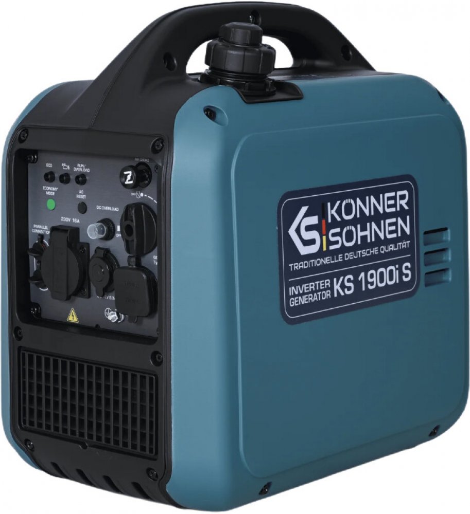 Könner & Söhnen KS 1900i S je moderní invertorová elektrocentrála s maximálním výkonem 2,0 kW a jmenovitým 1,9 kW, vybavená mikroprocesorovým invertorem, který zajišťuje čistý a stabilní výstup pro citlivé spotřebiče — notebooky, televize, navigace či lékařská zařízení.