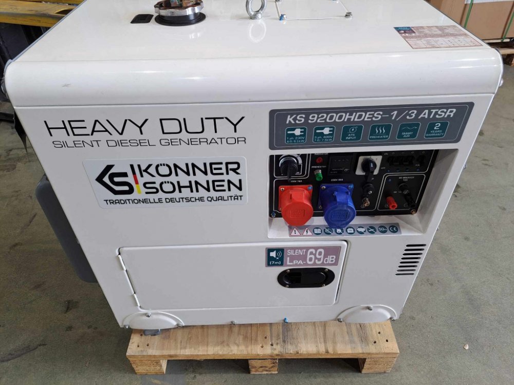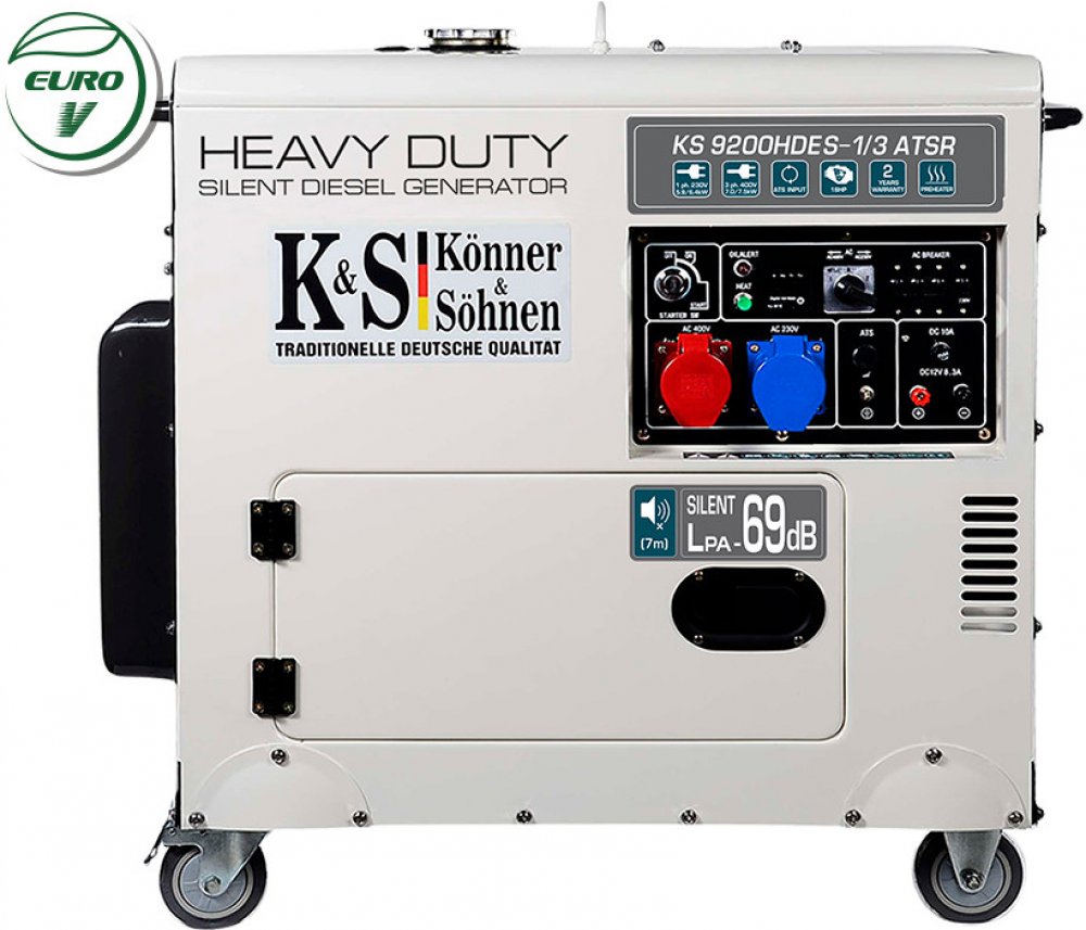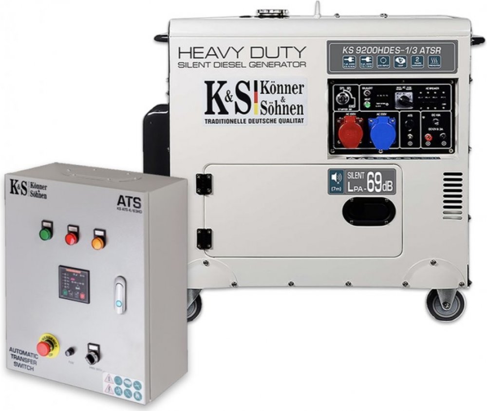 KS 9200HDES-1/3 ATSR je výkonná naftová elektrocentrála řady HEAVY DUTY SILENT, která se pyšní robustním krytem, celoročním krytem, který tlumí hluk a je odolný proti vnějšímu poškození. Poskytuje tak účinnou ochranu elektrocentrály a prodlužuje její životnost. Skříň je vybavena držadly a kolečky pro snadný pohyb elektrocentrály. Je vybavena výkonným značkovým motorem Könner & Söhnen, který lze použít nejen jako záložní zdroj energie, ale i k nepřetržitému provozu. Mimo jiné je elektrocentrála vybavena předehřívačem, který umožňuje snadné spuštění elektrocentrály i v zimě. Tento model je navíc vybaven systémem fázového spínání VTS, díky němuž není potřeba kupovat dvě samostatné elektrocentrály. Tento systém dokáže jednoduše přepínat mezi fázemi - 230 V (jednofázový režim) a 400 V (třífázový režim).