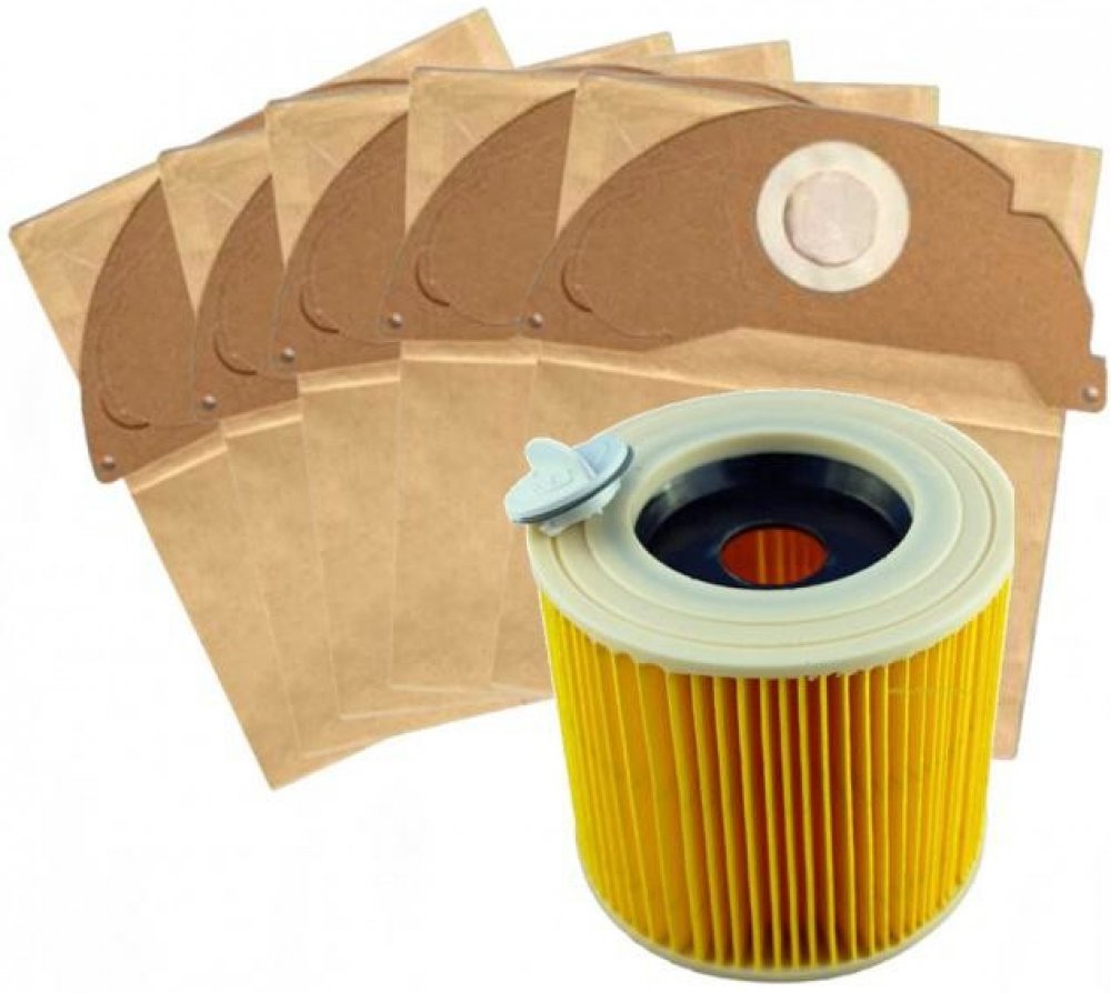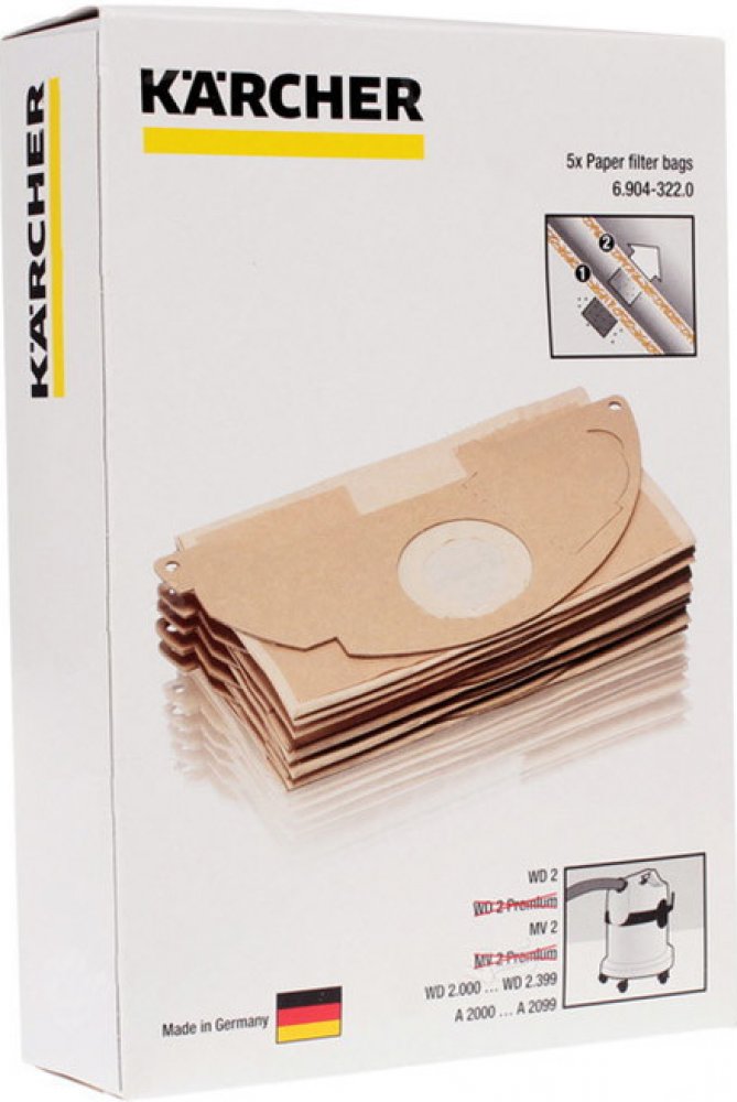 Sada HEPA filtr do vysavače KARCHER Org. Gr. 6.904-322 a sáčky 1+5ksSada HEPA filtr patronový a 5ks filtračních sáčků pro vysavače KÄRCHER A2004, KÄRCHER WD 2.500 v jednom balení sáčků s filtry výrobce KÄRCHER 6.414-552.0, KÄRCHER 6.904-143.0 kompatibilní, jsou vhodné pro modely uvedené níže. Filtrační patrona s aretační pojistkou v příslušenství.
