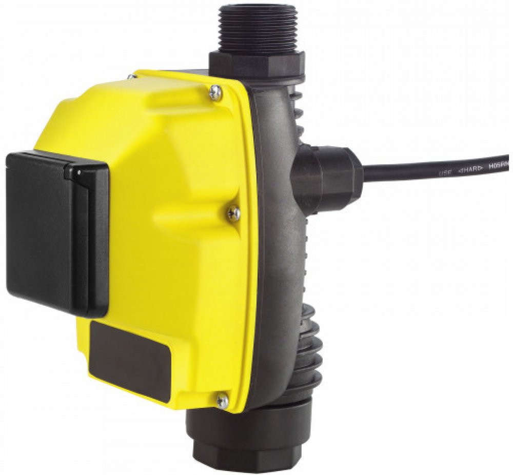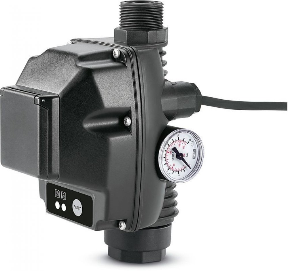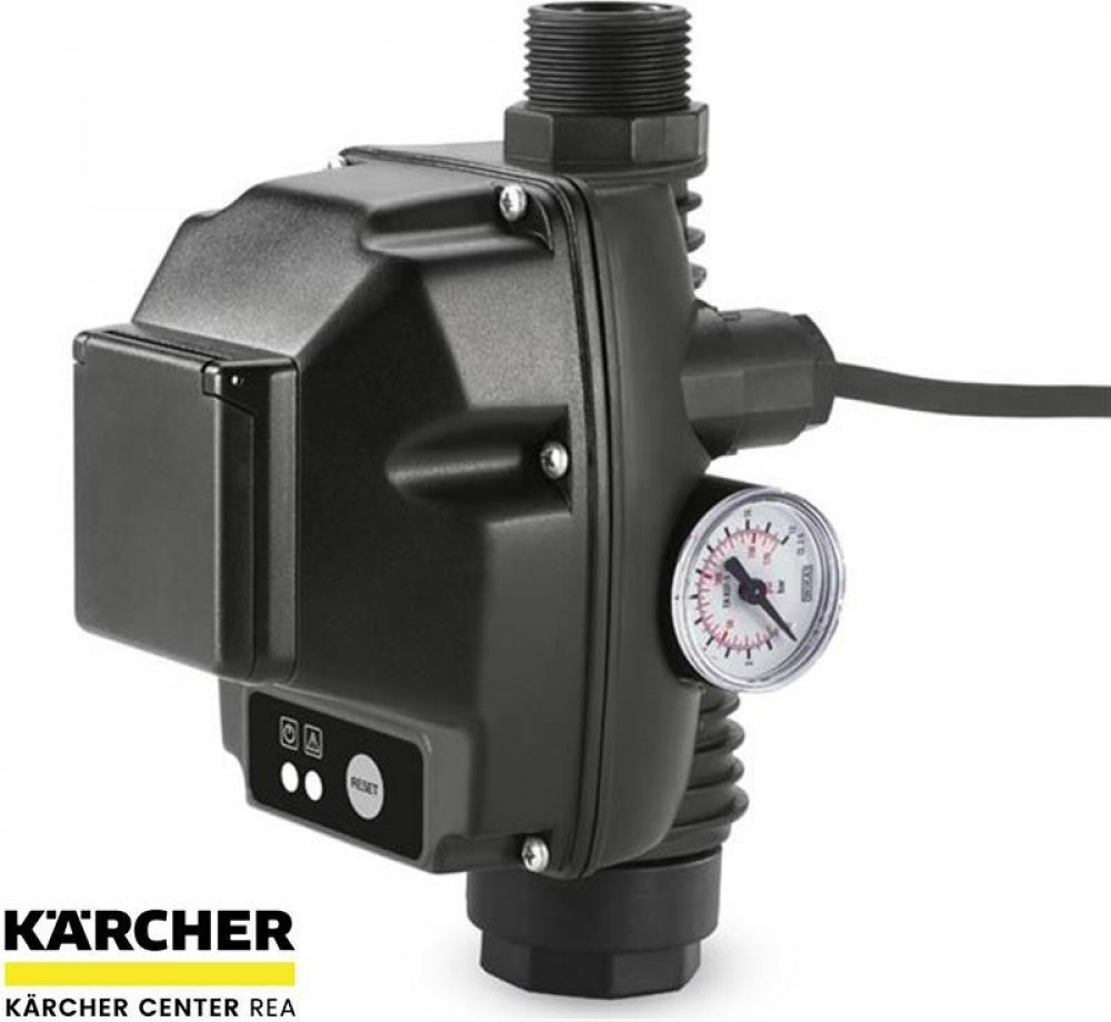 Kärcher - Elektronický tlakový spínač s pojistkou proti chodu na sucho Ideální k přestavbě zahradního čerpadla na domácí vodní automat. V případě potřeby se čerpadlo automaticky zapne a vypne. Pokud čerpadlem neprotéká žádná voda, chrání pojistka proti chodu na sucho čerpadlo před poškozením a automaticky ho vypojí. S G1” (33,3 mm) připojovacím závitem.