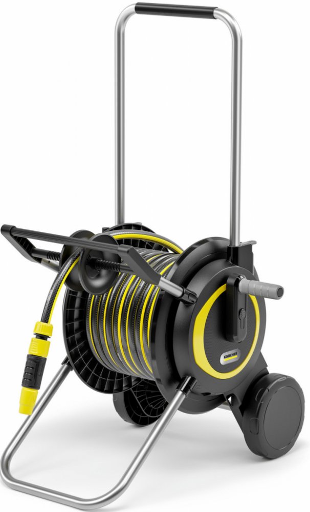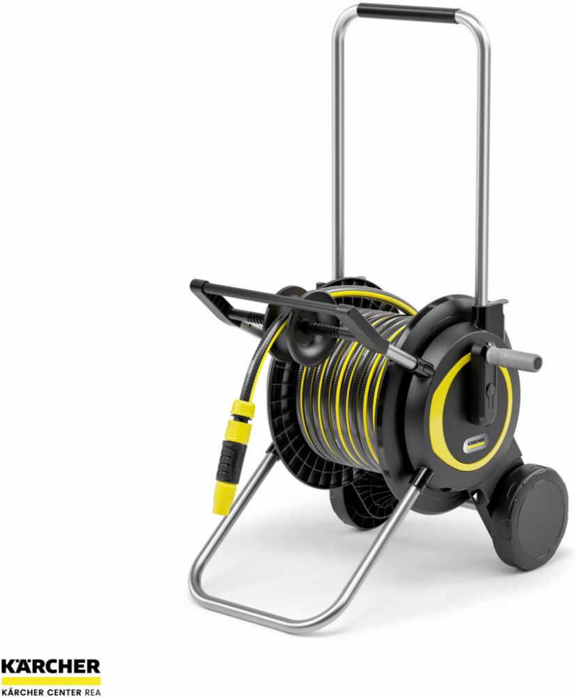 Hadicový vozík + 20m hadice Kärcher HT 4.20 SET Stabilní a robustní vozík na hadici umožňuje prostorově úsporné skladování zahradní hadice a je velmi pohodlný při používání. Hadici lze spolehlivě navinout pomocí ergonomické kliky a robustního vedení hadice. Vozík na hadici boduje také extra širokou základnou pro maximální stabilitu a odolností proti UV záření a mrazu. Díky inovativním rychloupínac...