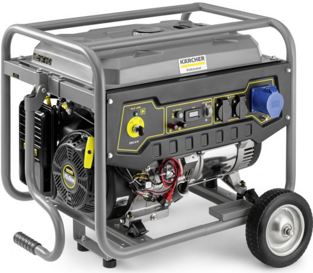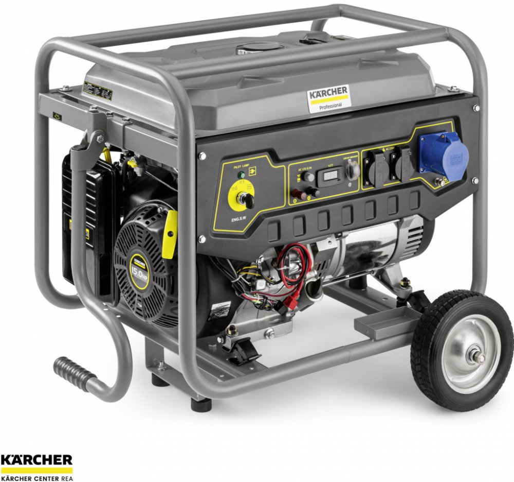 Synchronní generátor 230 V spolehlivě poskytuje trvalý výkon 5,5 kW. Silný benzinový motor pro pracovní intervaly min. 6,5 hodiny na jednu nádrž. Provoz vysokotlakých čističů Kärcher