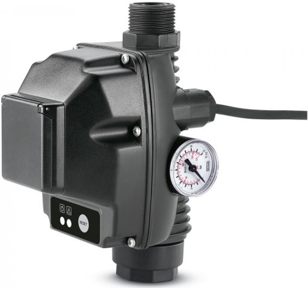 Elektronický tlakový spínač automaticky čerpadlo vypne, pokud potřebuje vodu, a potom znovu zapne. Nepustí do čerpadla žádnou vodu, například když je vodní nádrž prázdná, automaticky chrání nekontrolovatelné poškození čerpadla. Ideální řešením pro propojení zahradního čerpadla s domácími automaty na vodu. Elektronický tlakový spínač je k dispozici s připojovacím závitem G1 (33,3 mm).