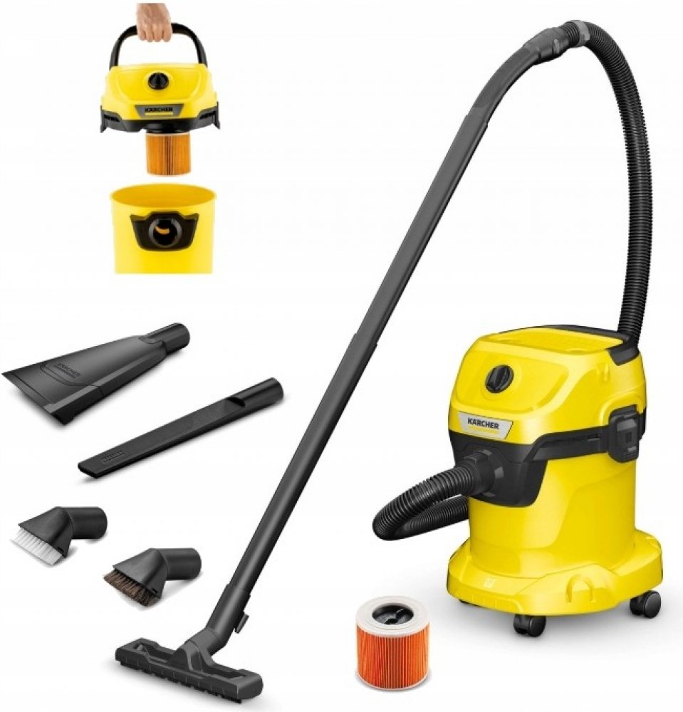 Víceúčelový vysavač WD 3 V-15/4/20 CAR od značky Kärcher je ideálním pomocníkem na jemné, hrubé, suché i mokré nečistoty. Využijete jej nejen v domácnosti, ale také v dílně, na zahradě a při úklidu auta. Funkce fukaru se perfektně hodí například na nečistoty ve štěrku a na těžko přístupná místa. Díky speciálním nástavcům lze s vysavačem spolehlivě vyčistit interiér vozidla a čalouněný nábytek. Hadici lze uložit na hlavě vysavače, kabel má své místo také na těle nástroje na kabelových háčcích. Praktický odkládací prostor v horní části je ideální na odkládání menších dílů. Odpad sbírá 15l nádoba, která je vyrobená z odolného plastu a efektivně odolává nárazům. Součástí dodávky je jednodílný patronový filtr, filtrační sáček z fleecu, hubice na čištění auta spolu s kartáčem s tvrdými a měkkými štětinami, dlouhá štěrbinová hubice, 2m sací hadice a klasická hubice na mokro-suché vysávání.