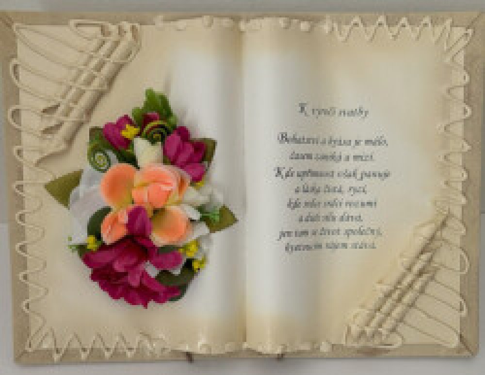 Kniha balená v průsvitném celofánu, na stojánku, převázanou mašličkou postavená na měděném stojánku.