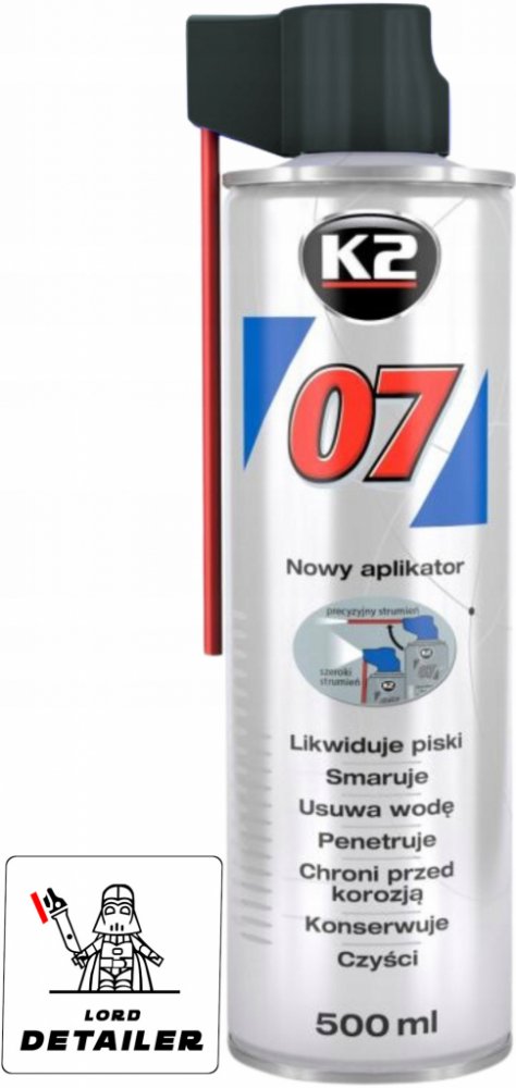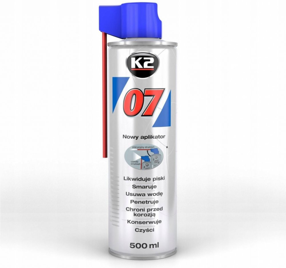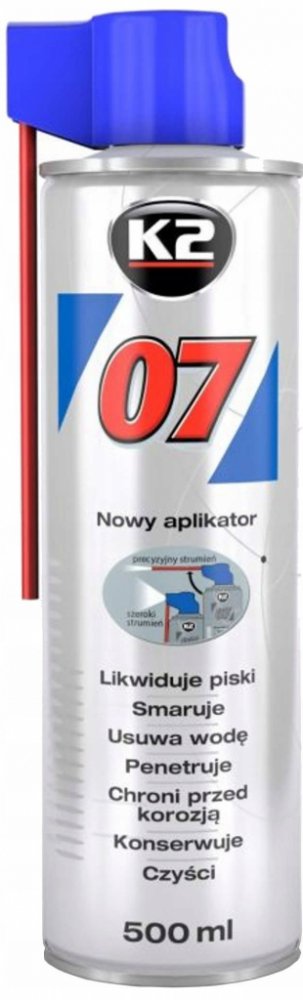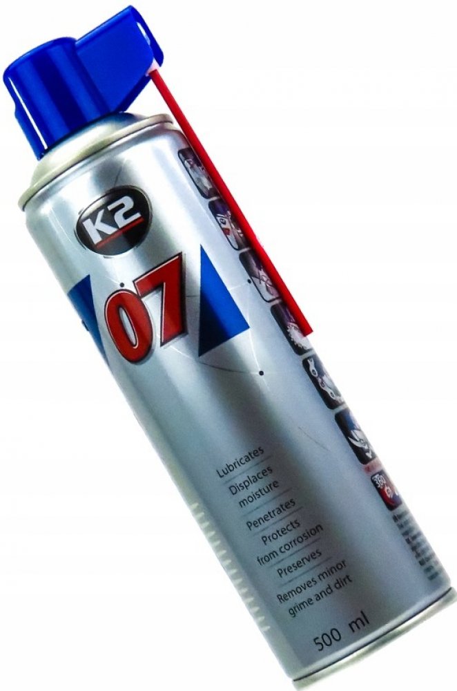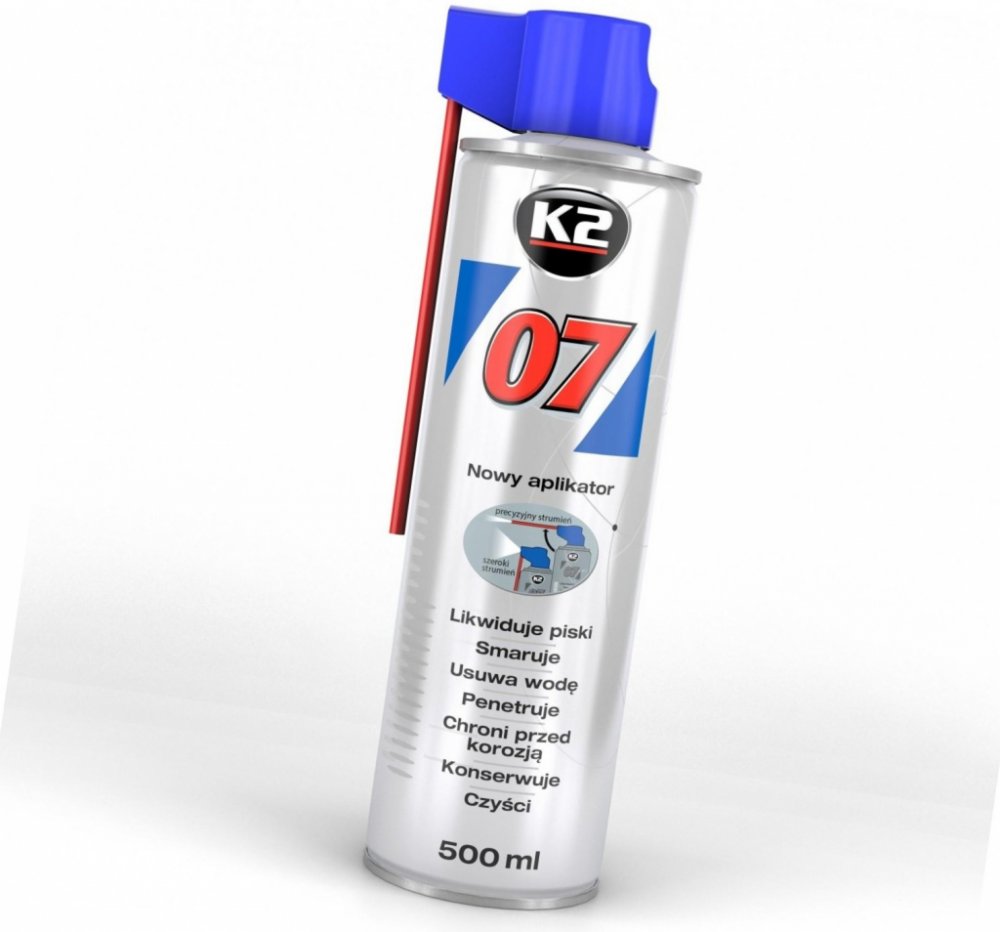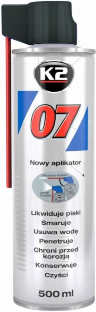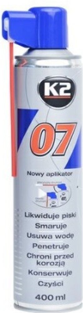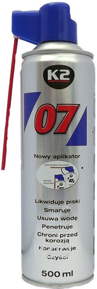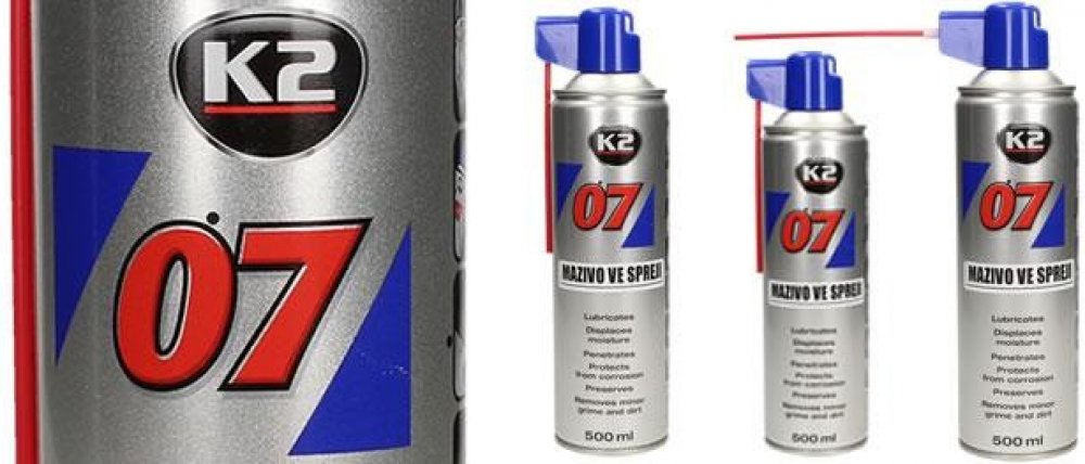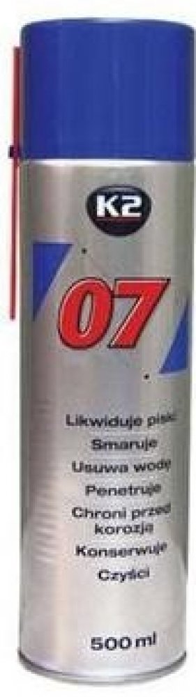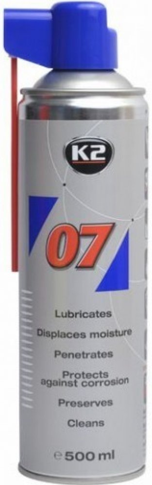 K2 07 - účinný víceúčelový sprej. Má široké použití. Může se používat v poloze "vzhůru nohama" co nemá vliv na celkové využití přípravku. Nastříkejte na povrch a neotírejte. Po odpaření rozpouštědla zůstane trvalá ochranná vrstva. Maže závěsy v dveřích, zámky, šicí stroje, kancelářské židle, žaluzie a mnoho jiného. Odstraňuje vrzání a pískot. Konzervuje a značně prodlužuje životnost strojů a zařízení. Odpuzuje vodu z různých zapalovacích zařízení (tradičních i nejnovějších elektronických), zabezpečuje spolehlivý start motorů ve všech povětrnostních podmínkách. UVOLŇUJE lehce "zapečené" šrouby, matice a pod. ČISTÍ, rozpouští drobné usazeniny z mastnot, gumy, lepidel a vosku. Omezuje tvorbu kamene na vodovodní baterii. Nepřitahuje nečistoty a prach. CHRÁNÍ PŘED KOROZÍ a před vytvářením nových ohnisek koroze na ošetřených místech a součástkách. Odmrazuje zámky a zabraňuje před opětovným zamrzáním.