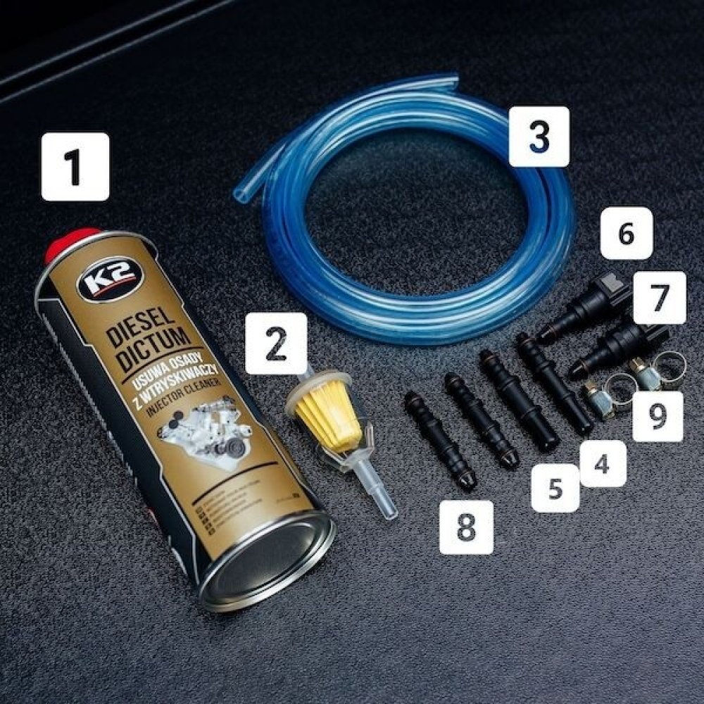 Multifunkční prostředek na čištění injekcí K2 Diesel Dictum:- snižuje spalování vyčištěním vstřikovačů a obnovením správné atomizace vstřikovaného proudu paliva- výrazně snižuje problém kouření (charakteristický černý kouř dieselových motorů) omezením množství škodlivých zplodin vypouštěných do atmosféry- usnadňuje startování motoru v zimě- maže a chrání napájecí systém před korozí, což výrazně prodlužuje životnost vstřikovačů a palivového čerpadla- zvyšuje výkon motoru- ztlumí a uklidní motor na volnoběh