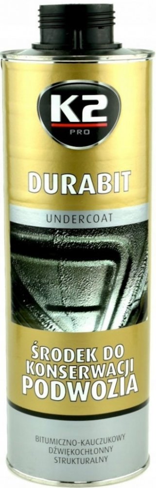 K2 DURABIT je odolný a účinný prostředek pro údržbu podvozku na bázi bitumenu a pryže. Prostředek na asfalto-gumového povlaku základě chránící podvozek vozidla před působením mechanických látek, jako jsou kameny, voda a soli. Působí potlačením zvuku a vytváří pružný a odolný ochranný povlak.