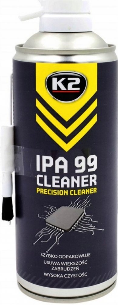 K2 IPA 99 CLEANER Popis: K2 IPA 99 Cleaner je vysoce kvalitní isopropylalkohol (IPA) s vysokou úrovní čistoty. Vyloučením všech zbytečných přísad, které se v produktech tohoto typu často vyskytují, jsme vyvinuli produkt s vynikajícími čisticími a odmašťovacími vlastnostmi. IPA Cleaner odstraňuje mimo jiné: oleje, tuky, tuky, inkousty, tepelně vodivé pasty. Díky tomu nachází velmi široké uplatnění, vč v čištění optiky , mechaniky, elektroniky, automobilového průmyslu. Je perfektní pro odstraňování nečistot ze čteček optických médií (CD, DVD, Bluray), PCB, všech druhů mechanismů a hlav používaných v audio-video zařízení nebo ultrazvukových čističek. K2 IPA 99 sprej isopropylalkohol se rychle odpařuje, nezanechává stopy a je chemicky neutrální. Je bezpečný jak pro uživatele, tak pro povrch, na kterém se používá. IPA odmašťovač je k dispozici ve vhodné formě ve spreji. Velká a účinná 400ml plechovka je vybavena aplikátorem brčka umožňujícím přesnou aplikaci. Sada obsahuje i překrytí štětcem. Použití: nastříkejte na čištěný povrch nebo otřete vlhkým hadříkem.