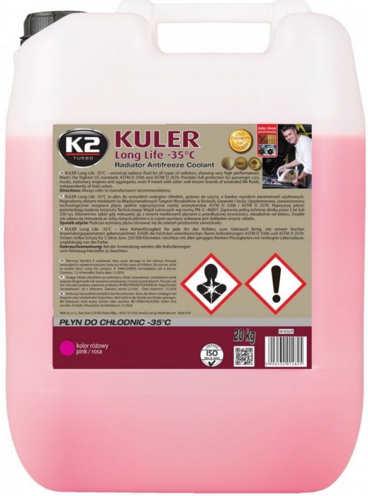 K2 Kuler -35°C je moderní, univerzální, chladicí kapalina připravená k použití, která se vyznačuje velmi vysokými provozními parametry. Tento inovativní produkt byl oceněn zlatými medailemi na Mezinárodním veletrhu vynálezů v Bruselu, Ženevě a Soulu. ZABEZPEČUJE OPTIMÁLNÍ PRACOVNÍ TEPLOTU Speciálně vyvinutá receptura K2 Kuler -35°C chrání motor před přehřátím v létě a před zamrznutím v zimě, čímž zajišťuje jeho optimální provozní teplotu po celý rok. S K2 Kuler je motor vždy v dobré kondici. NÁVOD K POUŽITÍ: 1. Odstraňte použitou chladicí kapalinu a propláchněte systém vodou nebo speciálním prostředkem na proplachování chladiče (např. K2 Radiator Flush). 2. Naplňte systém hotovou chladicí kapalinou. 3. Nastartujte motor a odvzdušněte chladicí systém. 4. Po ochlazení doplňte kapalinu mezi úrovně MIN a MAX na nádržce. Poznámka: Frekvence výměny kapaliny je uvedena v návodu k obsluze vozidla. Obvykle se jedná o každých 60 000 km nebo každé 3 roky.