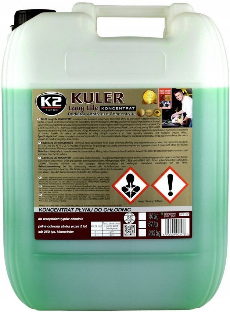 K2 KULER koncentrát je moderní a univerzální koncentrát do chladičové kapaliny, vyznačující se velmi vysokými výkonovými parametry. POSKYTUJE OPTIMÁLNÍ PRACOVNÍ TEPLOTU Speciálně vyvinuté složení v létě chrání motor před přehřátím a v zimě před zamrznutím. PLNÁ OCHRANA MOTORU NA 5 LET nebo 250 000 km Vynikající sada inhibitorů sestávající z karboxylových kyselin s přídavkem speciálních inhibitorů koroze a odpěňovačů chrání motor. Poskytuje plnou ochranu motoru po dobu 5 let nebo 250 000 kilometrů, také ve směsi s jinými značkovými kapalinami s prodlouženou životností, bez ohledu na barvu. Konkurenční objednací čísla: W416Z K2 W416Z nezařazený product K2 Chemie a autokosmetika