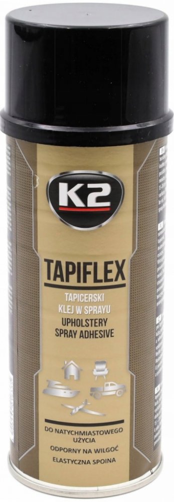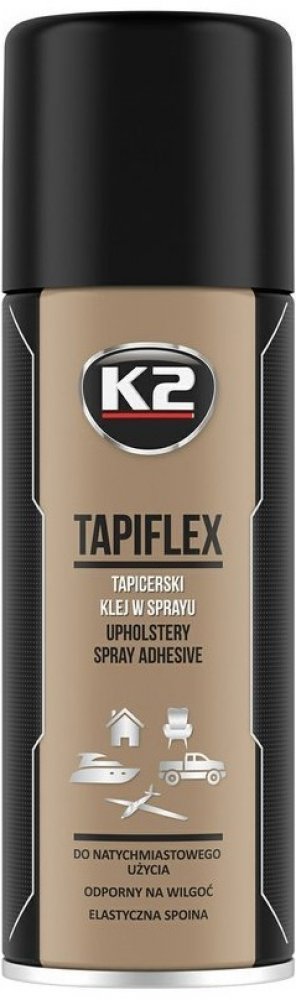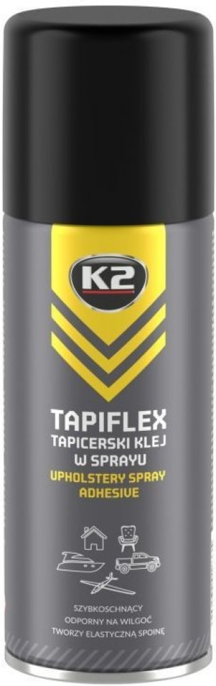 K2 TAPIFLEX je profesionální vysoce přilnavé lepidlo na čalounění ve spreji. Vyvinuto na základě vysoce kvalitních surovin. Spojované plochy jsou lepeny výjimečnou rychlostí a vysokou pevností spoje. Má vysokou účinnost a je zcela odolný proti vlhkosti. Poskytuje pevný, vysoce flexibilní spoj, který časem nedegraduje. Je odolný vůči stárnutí.