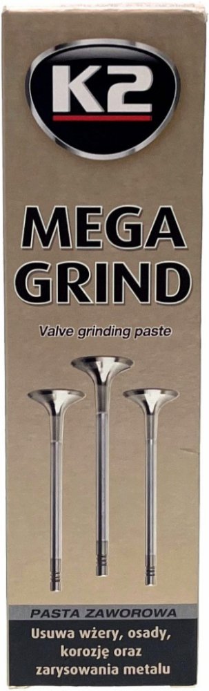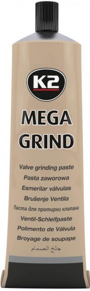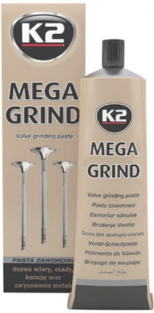 K2 MEGA GRIND - inovativní pasta pro lapování ventilů a ventilových sedel ve spalovacích motorech. Určeno pro použití ve všech typech motorů (benzín, nafta, LPG atd.). Díky svému modernímu složení pomáhá vyhladit a sladit všechny kovové povrchy, např. sedla a kuželky ventilů, bez velké námahy. Účinně odstraňuje poškození, šmouhy, usazeniny a korozi z kovových prvků, čímž zajišťuje efektivní provoz ventilového systému. Lze použít ručně i strojově. Výrobek je určen pro profesionální použití.K2 MEGA GRIND je unikátní produkt, vyvinutý pro použití v jednom kroku (ONE STEP pasta). Efektivní a ekonomické. Použití jediné pasty K2 MEGA GRIND zajišťuje optimální účinek, bez nutnosti použití mnoha past různých gradací, což se promítá do úspory času – a tedy i peněz.Jak používat:Naneste pastu na zátku ventilu.Vložte ventil do sedla ventilu a zapojte sedlo ventilu rotačním pohybem.Po dokončení vše otřete čistým hadříkem.