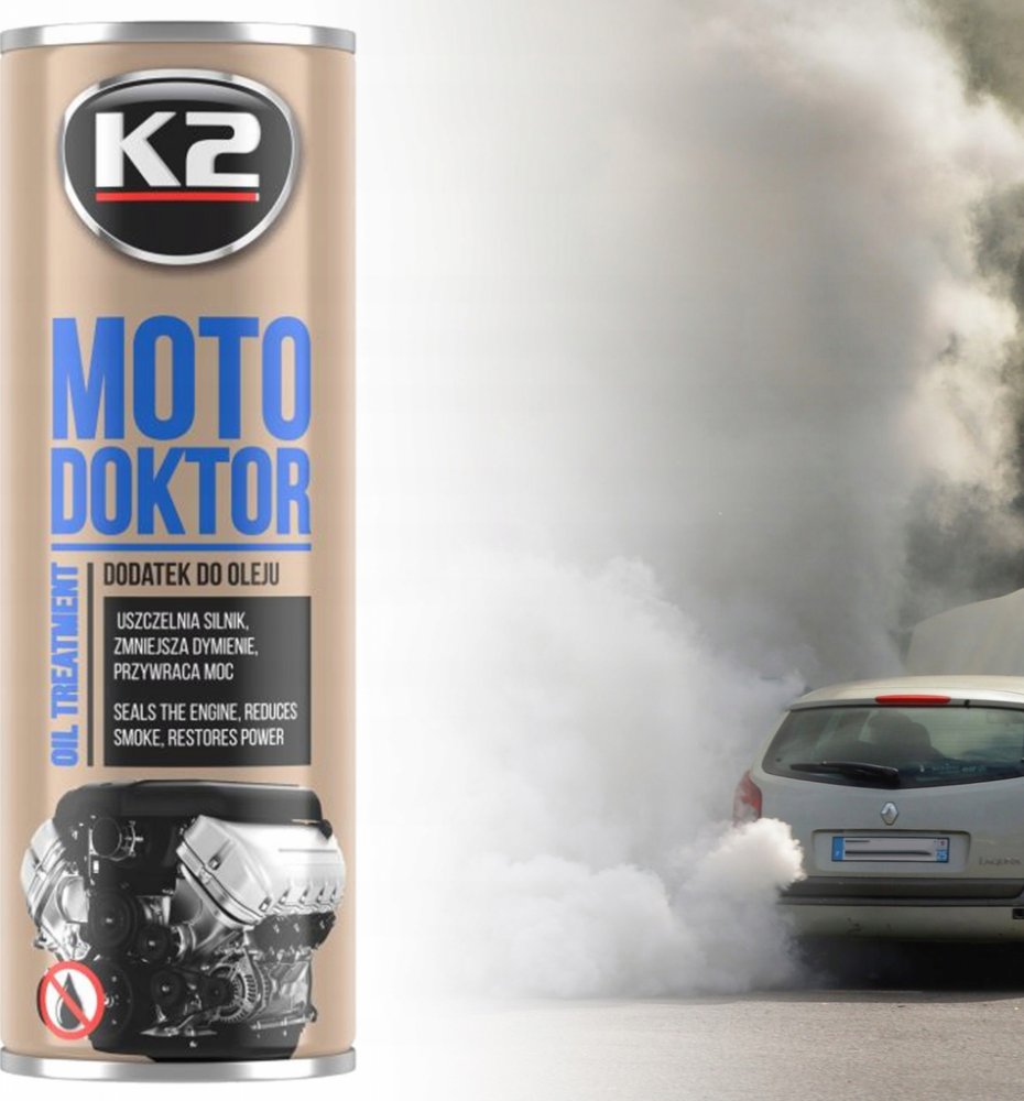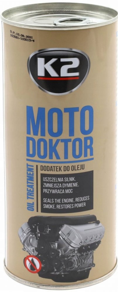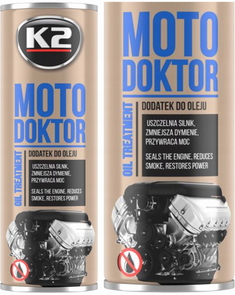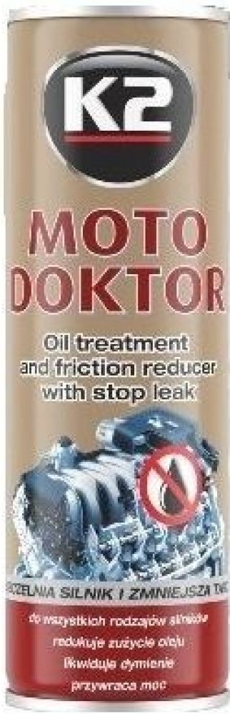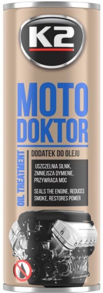 Nová přísada motorového oleje K2 MOTO DOKTOR byla vyvinuta a vyrobena pomocí inovativní technologie „NANOTECH“.Posiluje polymerní vazby oleje, což přispívá k výraznému snížení jeho spotřeby. Těsní pístní kroužky, což zvyšuje kompresi oleje a tlak. Utěsňuje suchá těsnění, obnovuje jejich pružnost a snižuje tření motoru. Díky svým vlastnostem snižuje náchylnost oleje k zuhelnatění, snižuje množství kalu motoru, což výrazně zvyšuje jeho životnost. Ztlumí motor, zvýší jeho výkon a zrychlí vozidlo. Vhodné pro všechny typy motorů, starších i nových.Může být použit v motorech poháněných LPG nebo CNG, benzínem, naftou - také u motorů s turbodmychadlem. Je mísitelný se všemi druhy minerálních, polosyntetických a syntetických olejů. Může být také použit pro diferenciály a převodovky i u převodových olejů třídy GL-5. Doporučeno zejména pro motory pracující v těžkém zatížení nebo v extrémních podmínkách (jízda v horách, v létě, při plném zatížení, časté startování studeného motoru, jízda ve městě, naložené dodávky). Neobsahuje škodlivé pro životní prostředí a člověka (P.T.F.E.)