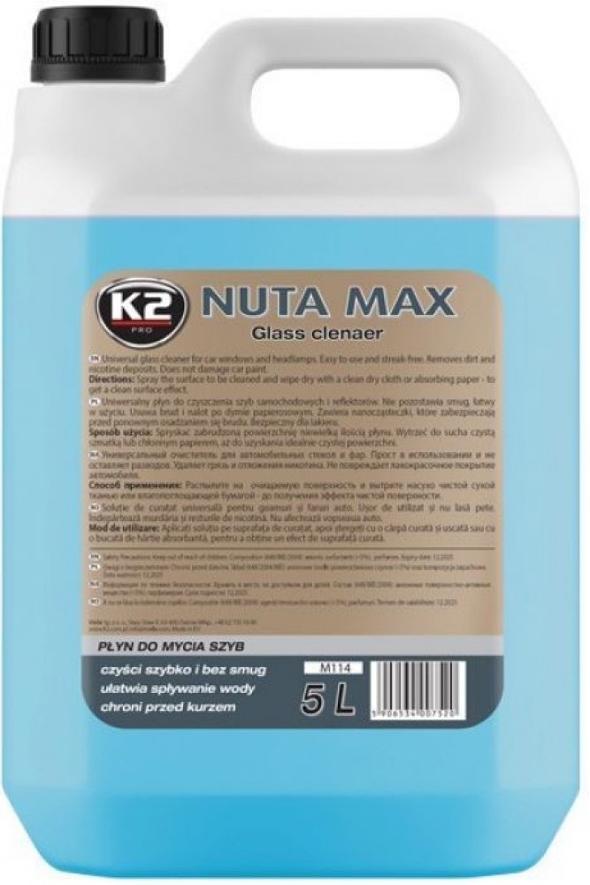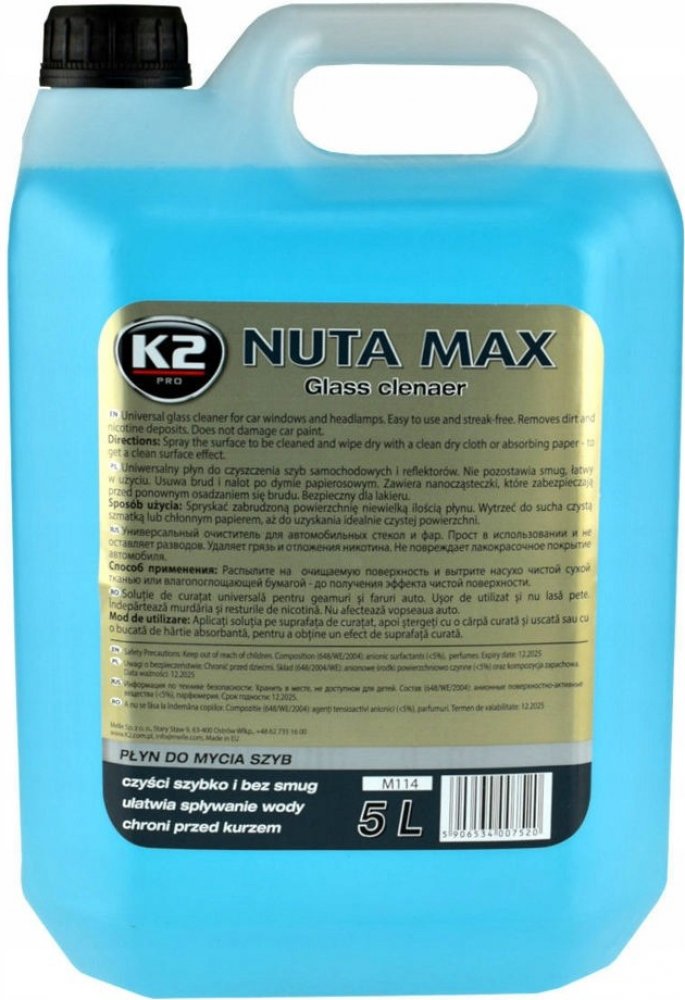 K2 NUTA MAX dokonale čistí skleněné povrchy, reflektory, plastové a laminované prvky. Bezpečné pro lak. Vhodný do auta i ven. Dokonale myje veškerý prach a usazeniny nikotinu z hladkých povrchů (brýle, karoserie, plasty, chromované povrchy, nerezavějící ocel, vinyl a další); nezanechává šmouhy.