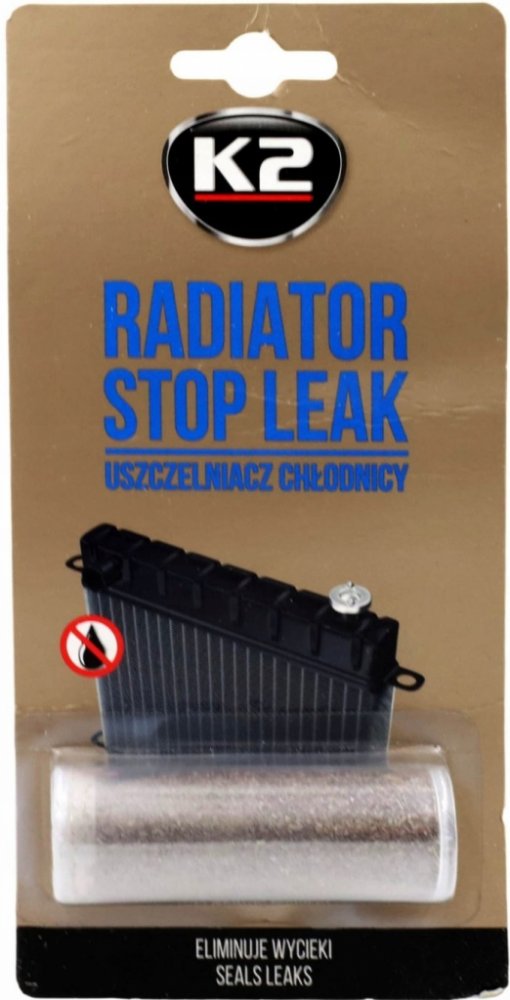 K2 STOP LEAK 18,5 G je rychle působící, účinný a zcela bezpečný těsnicí prostředek na netěsnosti chladiče s hliníkovými mikročásticemi. Je to nejprodávanější produkt tohoto typu v Polsku. Má velmi dobrou pověst mezi automechaniky. Unikátní částice těsnicího prostředku najdou i ty nejmenší netěsnosti a okamžitě je odstraní. Produkt nebrání cirkulaci chladicí kapaliny, a proto nesnižuje tepelnou účinnost chladiče. Lze jej použít ve všech typech chladičů, včetně hliníkových. Je mísitelný se všemi typy chladicích kapalin, včetně nejnovějšího typu „dlouhodobá životnost“. Jedno balení stačí pro systémy s objemem 10 l. NÁVOD K POUŽITÍ: 1. Zkontrolujte hladinu chladicí kapaliny, pokud je příliš nízká, doplňte ji na úroveň mezi min. a max. 2. Nastartujte motor, aby se chladicí kapalina mírně (pozor! Nebezpečí opaření). 3. Vypněte motor a nalijte prostředek plnicím otvorem chladiče nebo do nádržky. 4. Zavřete víčko plnicího hrdla chladiče a nastartujte motor. Veškeré netěsnosti by měly ustat do 15 minut. Pokud netěsnost přetrvává, bude pravděpodobně nutná oprava v autoservisu. Ponechání přípravku v chladicím systému zabrání dalším netěsnostem.