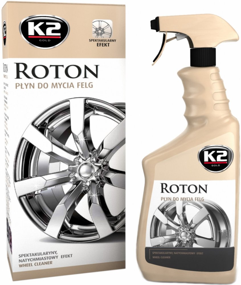 Kapalina na mytí disků. K2 ROTON neobyčejně odstraňuje a proniká do neústupné nečistoty, včetně kalů z brzdových destiček a z prašných cest. V době rozpuštění nečistot (3 až 4 min.) mění K2 ROTON barvu na tmavě červenou, což působí dojmem "krvácení kol" a to znamená, že je možné začít s opláchnutím. Odstraňuje nečistoty bez nebezpečí poškrábání povrchu. Určený pro všechny druhy ráfků a poklic.