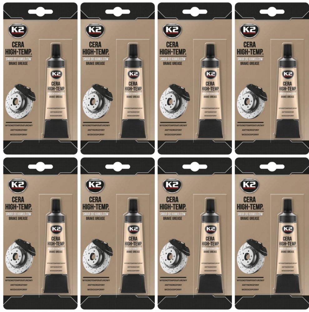 K2 CERA HIGH-TEMP. BRAKE GREASE je profesionální vysokoteplotní syntetické mazivo určené pro opravy, montáž a údržbu hydraulických komponentů. Lze jej použít k mazání pístů, válců a vodítek brzdových třmenů. Snižuje vibrace a vrzání. Chrání před korozí. NÁVOD K POUŽITÍ: Vyčistěte povrch. Naneste tenkou vrstvu maziva na pracovní plochu válce a pístu. Po montáži přebytečné mazivo setřete. Poznámka: ...