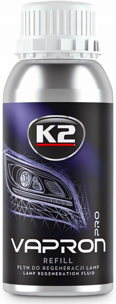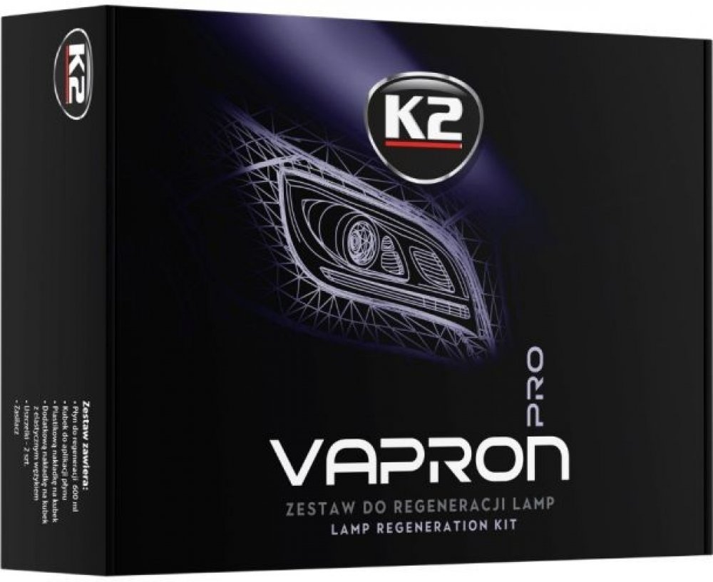 K2 Vapron je revoluční metoda regenerace poškozených světlometů bez nutnosti jejich demontáže. Souprava je založena na rekonstrukci průhledné polykarbonátové vrstvy (nejprůhlednějšího plastu použitého k výrobě krytů světlometů) nanesením nového tekutého polykarbonátového povlaku a přestavbou struktury stínítka lampy. K2 Vapron je profesionální sada pro regeneraci a ochranu poškozených světel, známá jako „čajová konvice“ nebo „kouzelná konvice“. Je ideální pro obnovu poškozených (matných, zažloutlých) světlometů bez ohledu na věk vozidla a stupeň poškození světel. Regenerace světlometů pomocí sady K2 Vapron je nejúčinnější a nejspolehlivější metodou renovace povrchu světlometu.