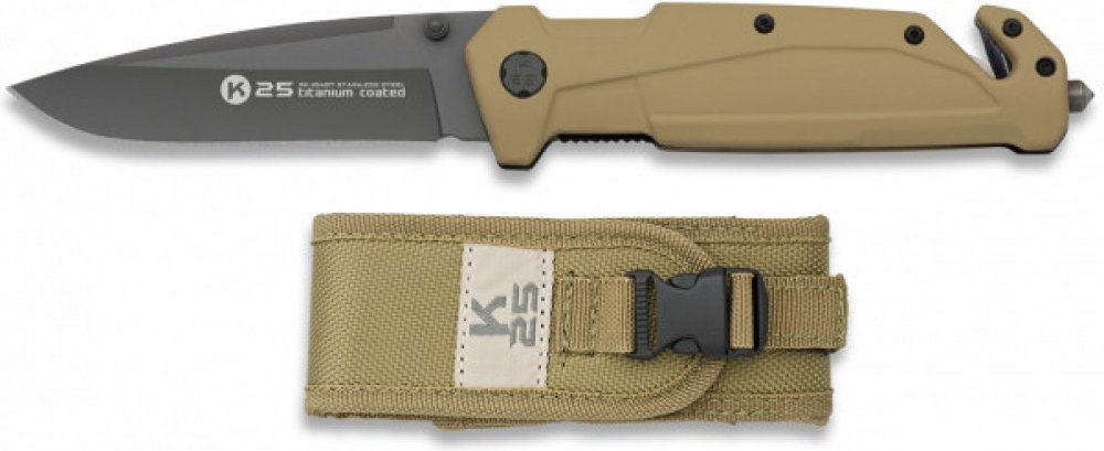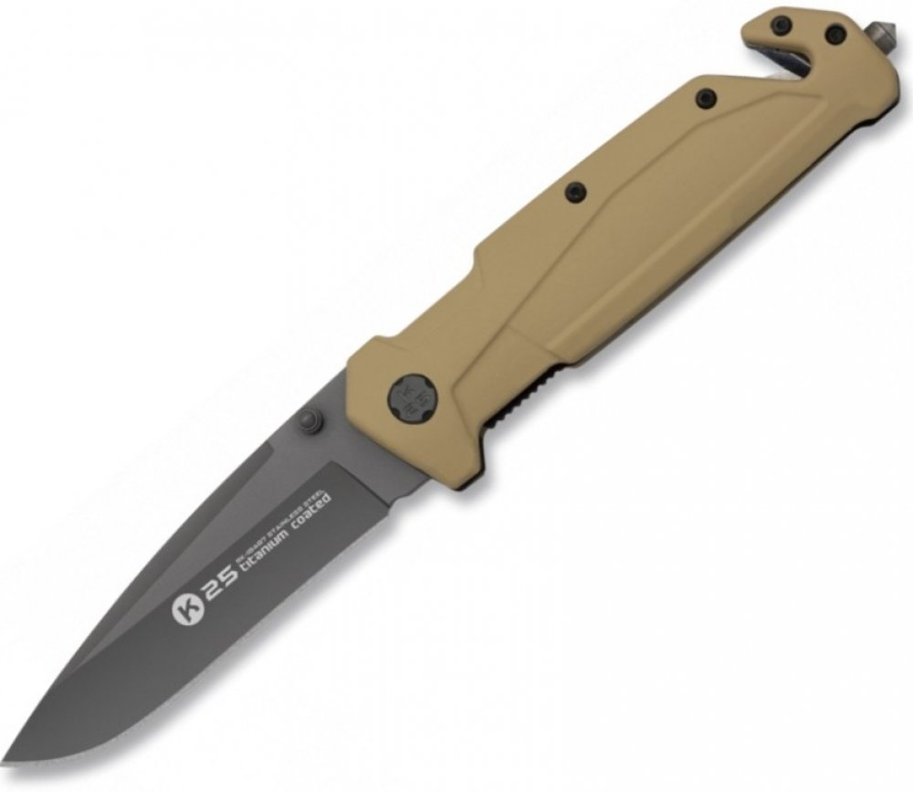 Rukojeť v pískové barvě je vyrobená z odolné gumy v pískové barvě. Na jejím konci najdete rozbíječ skla a řezák na popruhy. Souč...
