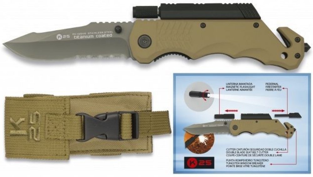 Záchranářský nůž K25 s dodatečnou svítilnou a křesadlem. Čepel nerez s titanovou vrstvou.