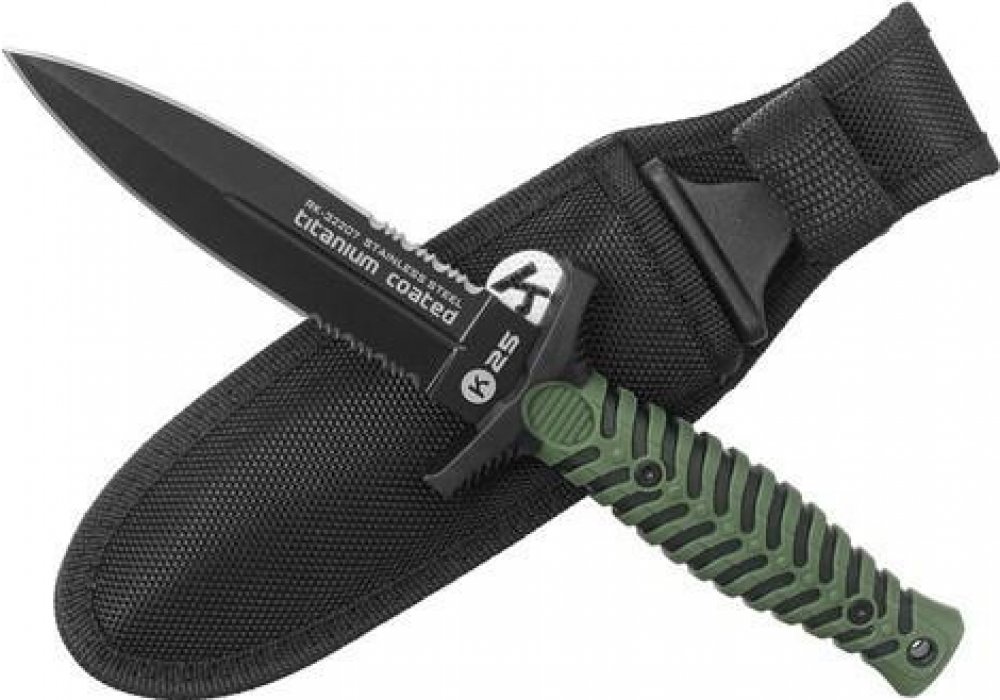 Taktický nůž v podobě dýky K25 32207 v černozelené barvě. Čepel broušená z jedné strany je z nerezové oceli 7Cr17MoV s titanovým povlakem proti korozi a nežádoucím odleskům. Nůž je z opačné strany vybaven krátkou pilkou. Rukojeť vyrobena z polymeu a gumy. Dodáváno s nylonovým pouzdrem. Specifikace: • kombinované ostří • profil čepele: Dagger • délka čepele: 125 mm • materiál čepele: nerezová ocel 7Cr17MoV • materiál rukojeti: polymer/guma • nylonové pouzdro • celková délka: 240 mm