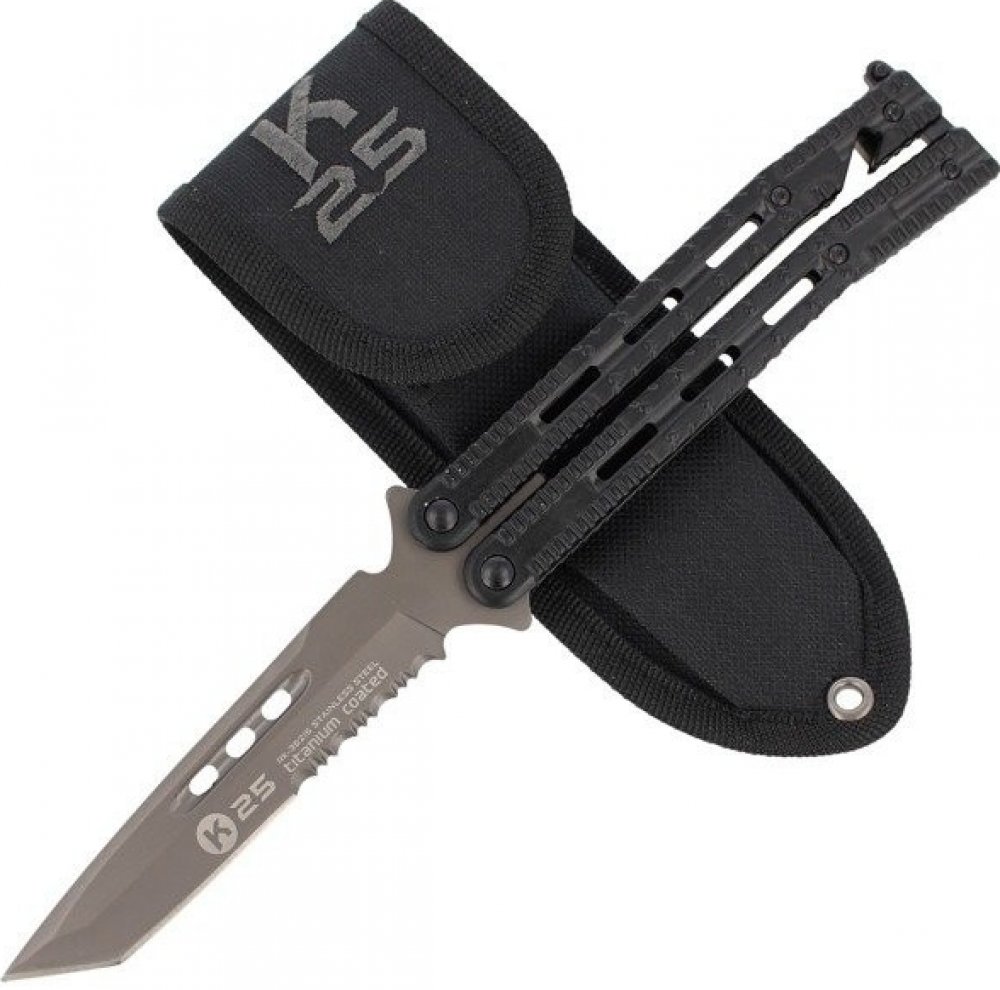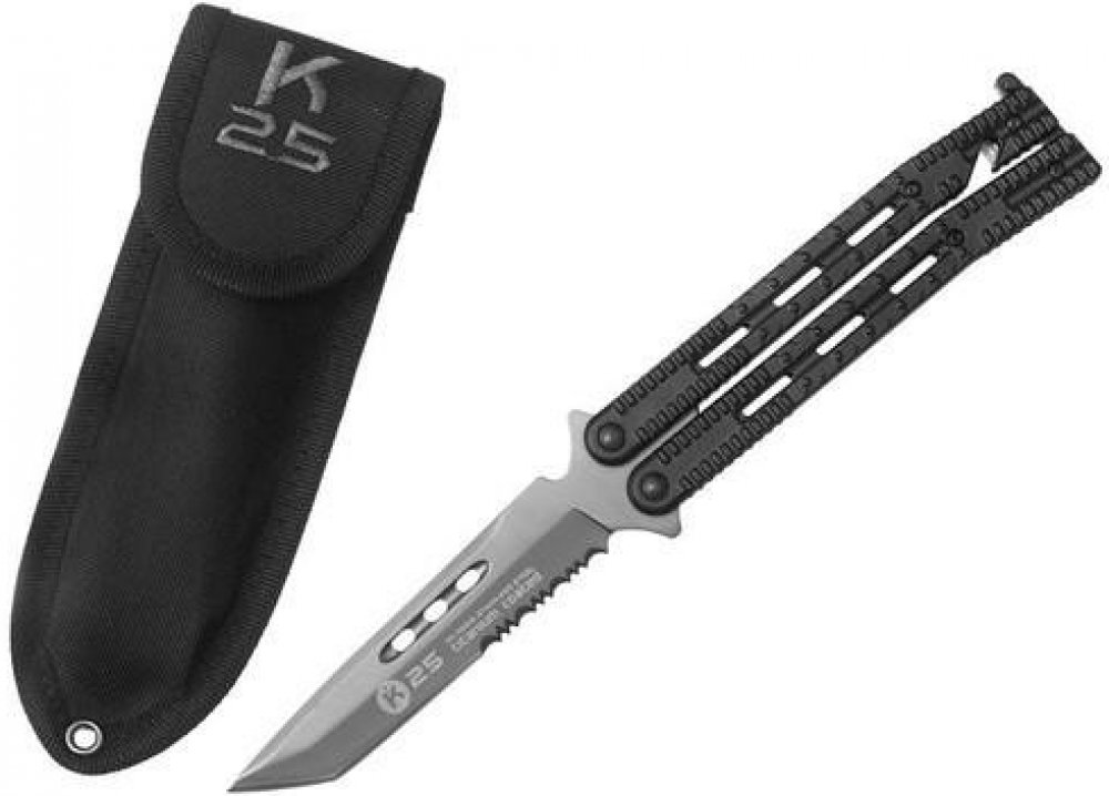 Taktický nůž typu motýlek RUI Tactical - K25 36215 s částečně zubatou tanto čepelí, hrotem na rozbíjení skla, řezačem pásů a černým nylonovým pouzdrem.