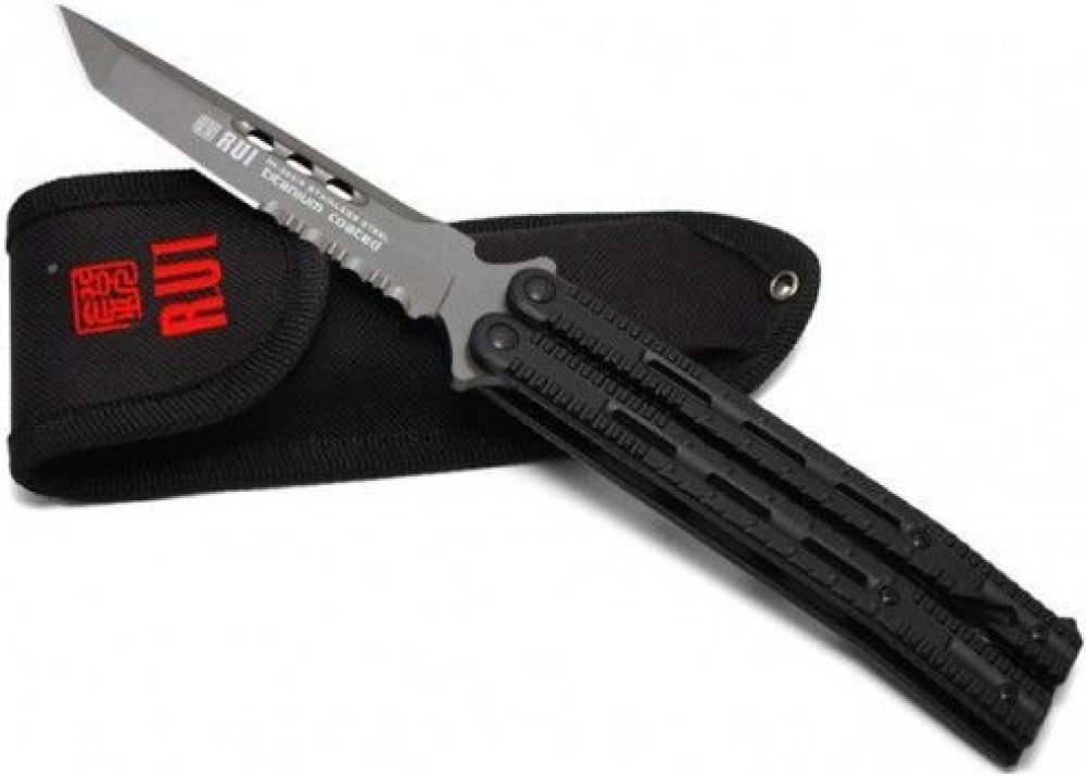 Kovový zavírací nůž, tzv. motýlek s tanto čepelí a šedým titanovým povrchem. Otevřete ho (nebo zavřete) jednoduše překlopením dvoudílné rukojeti a zajistíte pojistkou na konci rukojeti. V rukojeti jsou podlouhlé otvory a drážky proti vyklouznutí nože z ruky. V zavřeném stavu je na konci rukojeti hrot na rozbíjení skla, z druhé strany řezač popruhů. Součástí balení je nylonové pouzdro.Čepel: ocel 4...