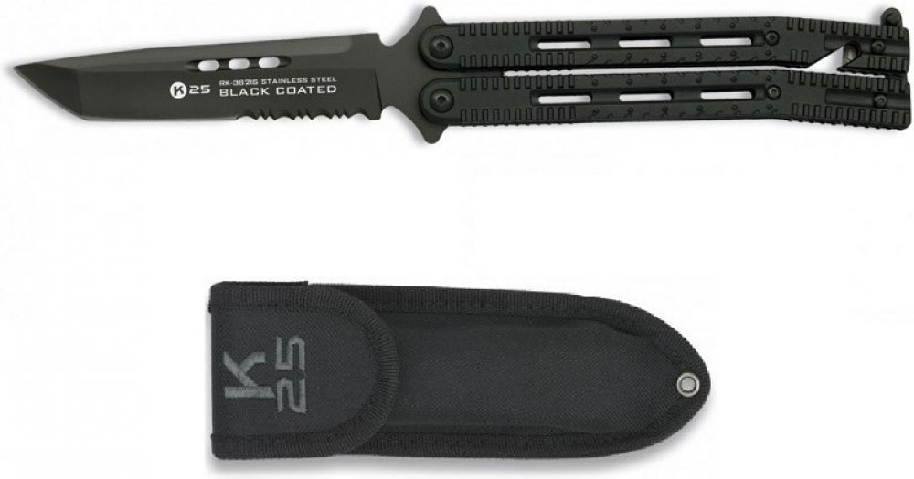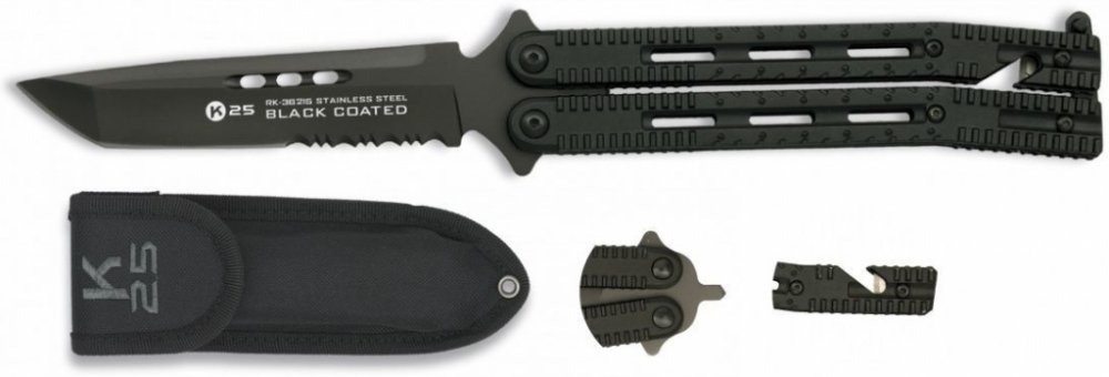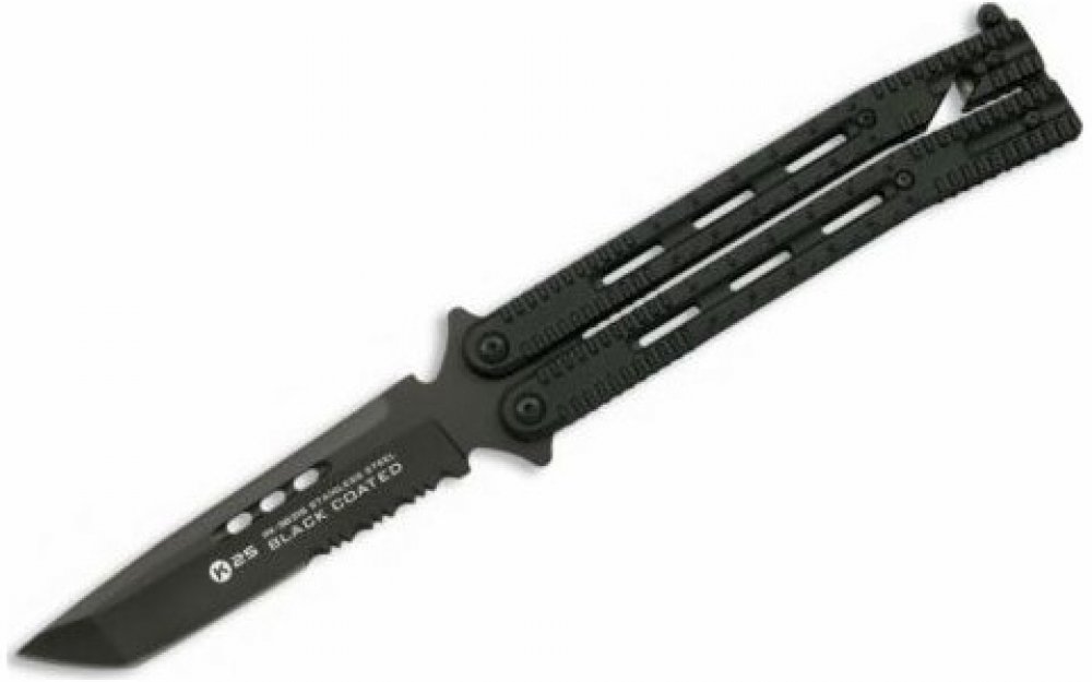 Kovový zavírací nůž, tzv. motýlek s tanto čepelí a šedým titanovým povrchem. Otevřete ho (nebo zavřete) jednoduše překlopením dvoudílné rukojeti a zajistíte pojistkou na konci rukojeti. V rukojeti jsou podlouhlé otvory a drážky proti vyklouznutí nože z ruky. V zavřeném stavu je na konci rukojeti hrot na rozbíjení skla, z druhé strany řezač popruhů. Součástí balení je nylonové pouzdro.Čepel: ocel 440Ostří: kombinované (částečně zoubkované)Celková délka: 25 cmDélka čepele: 11,5 cmVáha: 150 g