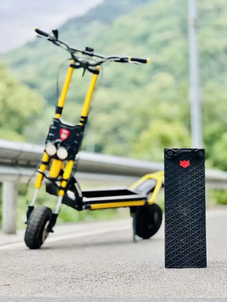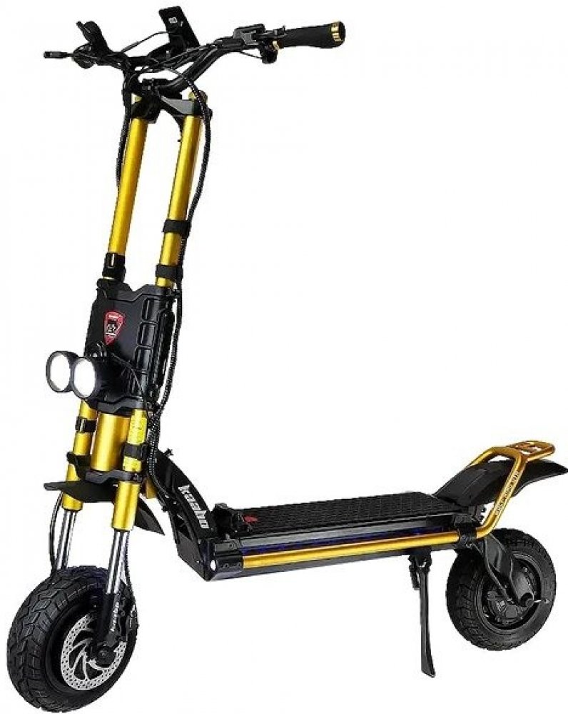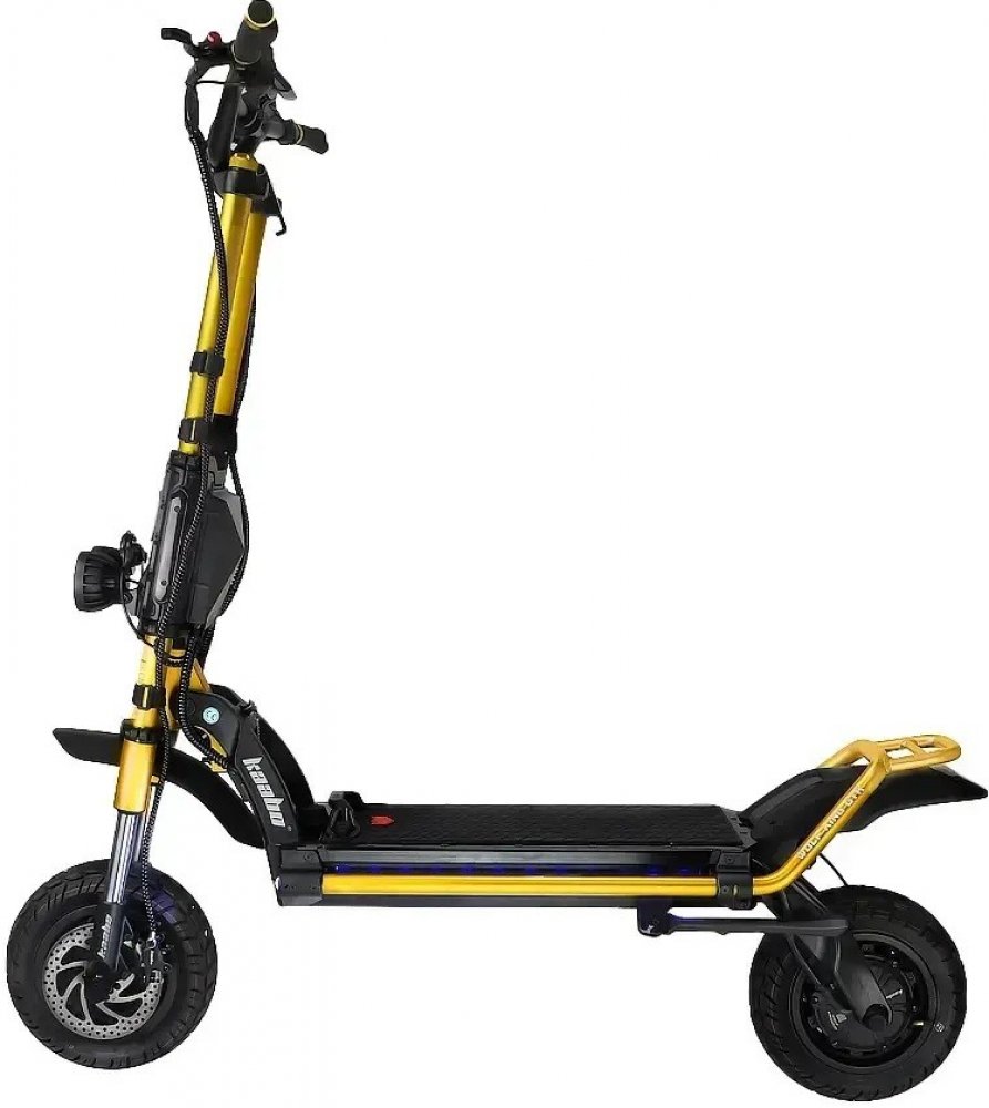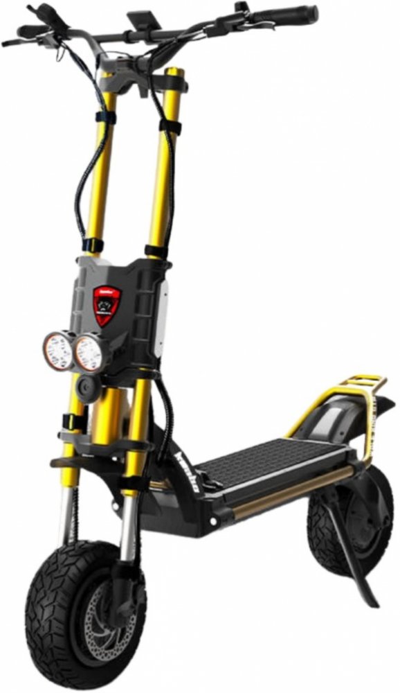Extrémně výkonná elektrická koloběžka se dvěma 2000W motory (špičkový výkon 13 440 W), maximální rychlost 25 km/h*, dojezd až 180 km, stoupání až 50°, IPX5, velká offroadová 12“ kola, LED světla, směrová světla, hydraulické odpružení, kotoučové hydraulické brzdy s ABS, skládací konstrukce, nosnost až 150 kg, kapacita baterie 35 Ah, přehledný LCD displej